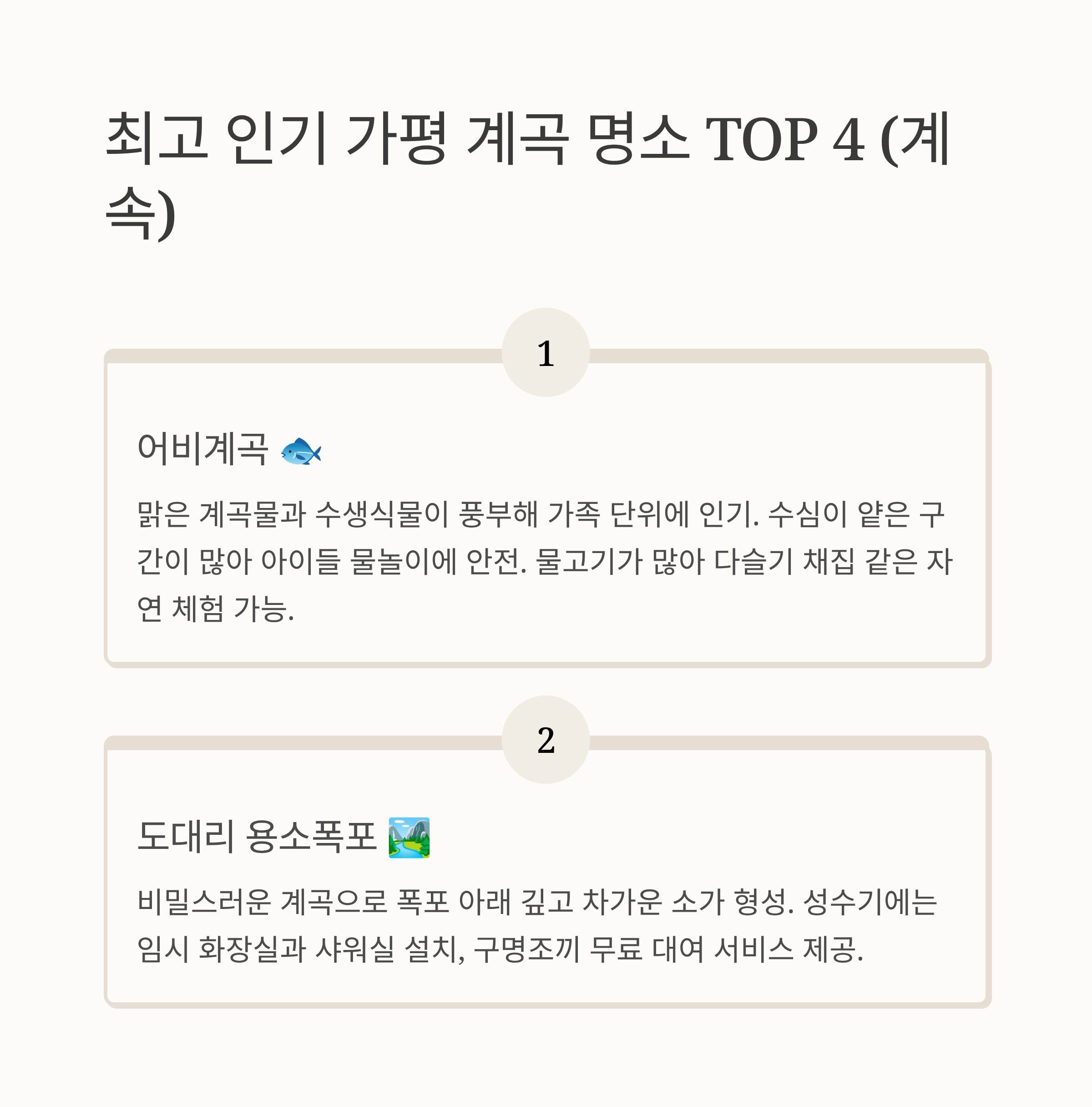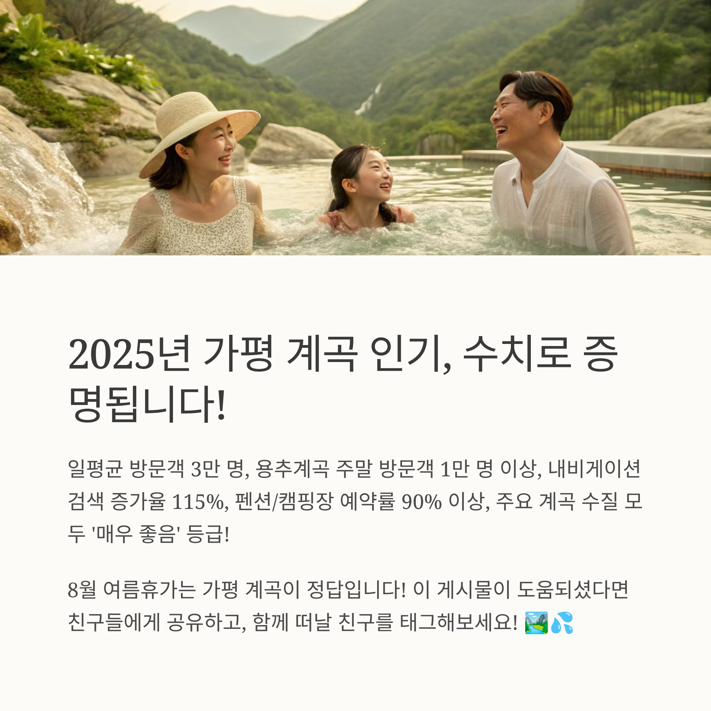 - 놀라운 통계: 일평균 방문객 3만 명, 내비 검색 증가율 115% 등 최신 데이터가 가평 계곡의 인기를 확실히 증명하고 있습니다.