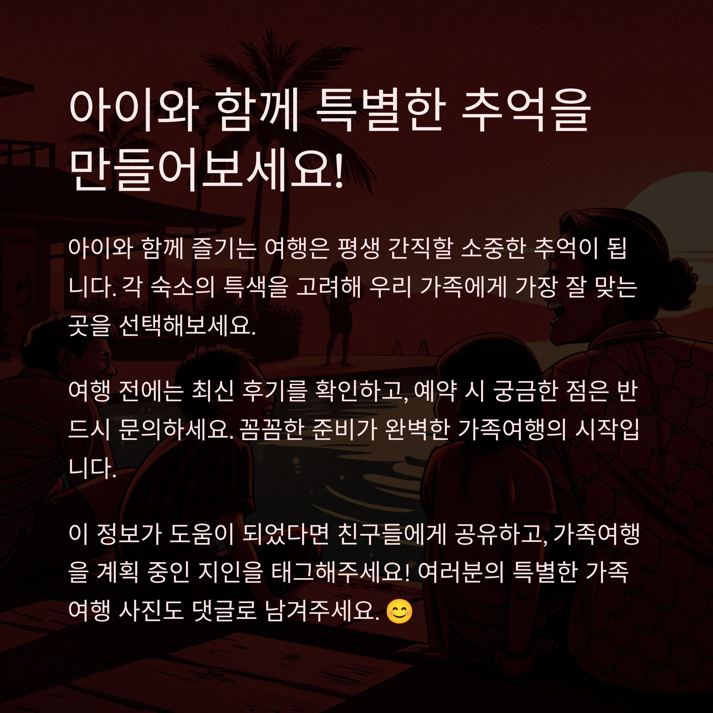 여러분의 가족에게 가장 적합한 숙소는 어디인가요? 이미 다녀오신 곳이 있다면 어떤 경험을 하셨는지, 또는 가보고 싶은 곳이 있다면 어떤 점이 끌리는지 댓글로 공유해 주세요!
