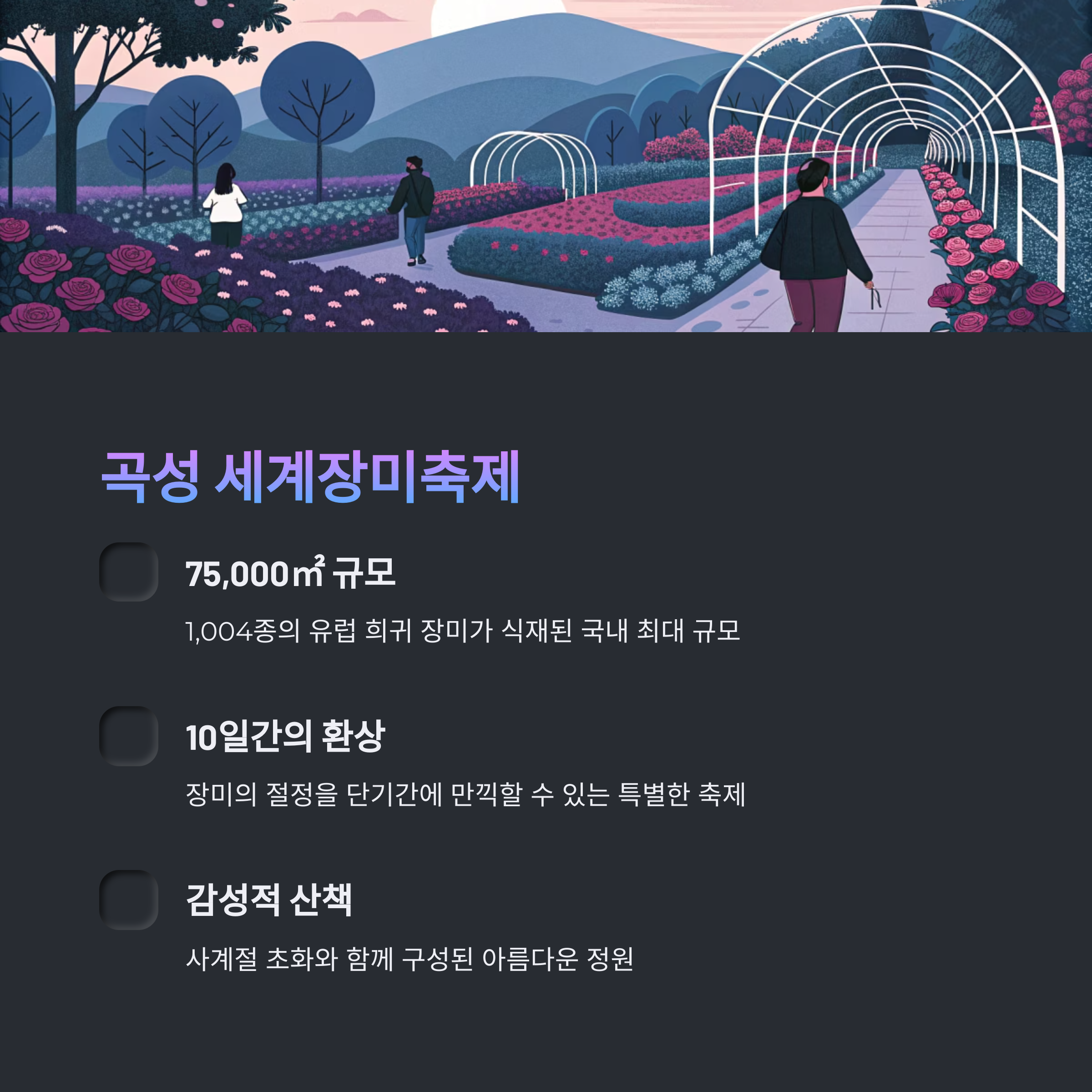 전라남도 곡성군에서 열리는 세계장미축제는 국내 최대 규모 중 하나로,