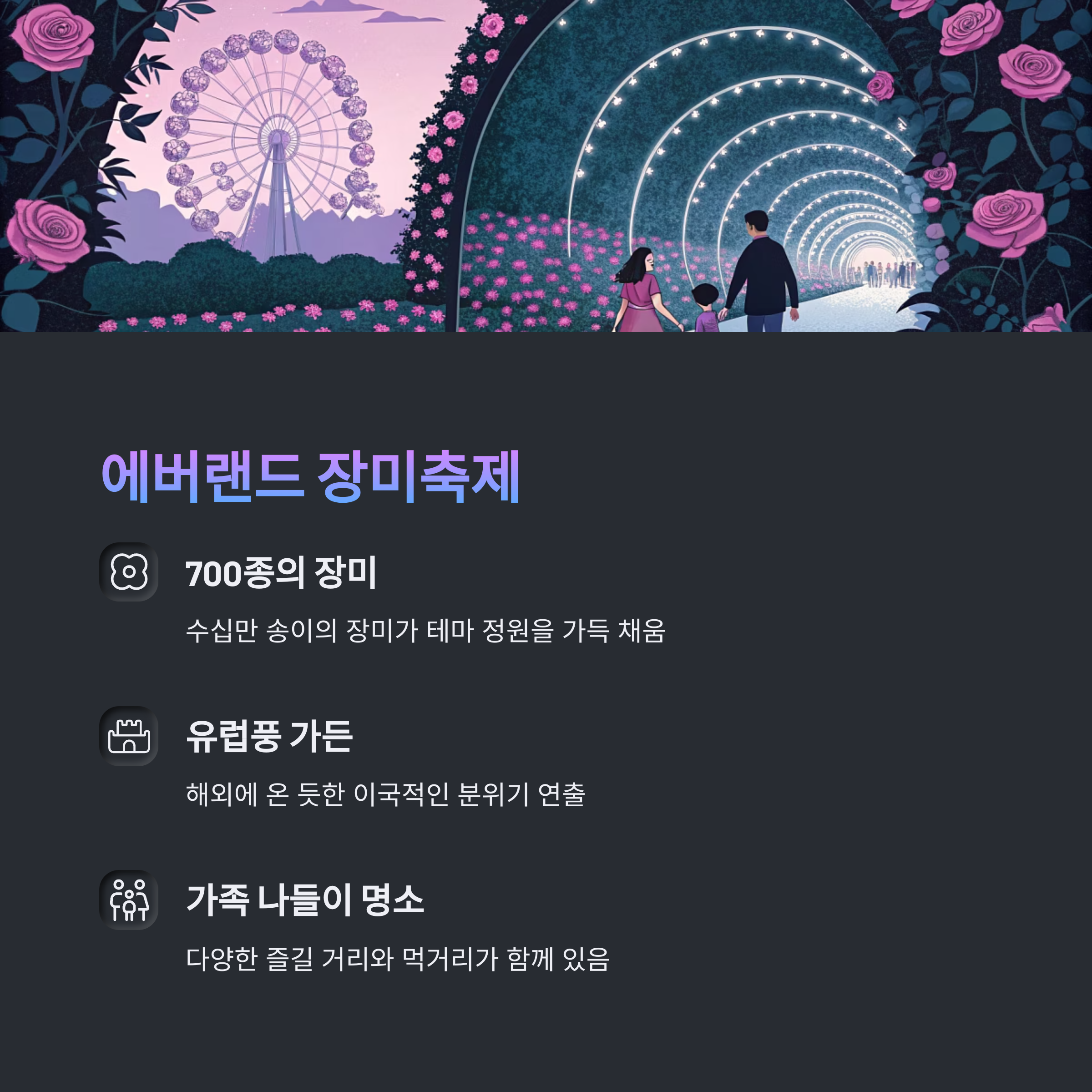 | 700여 종 | 588만 명 | 유럽풍 가든, 장미터널 |