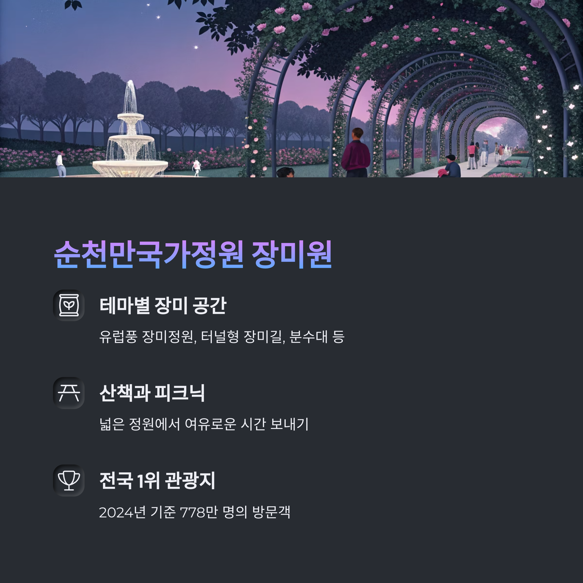 | 순천만국가정원 | 778만 명 | 유럽풍 장미원, 장미터널, 분수광장 |