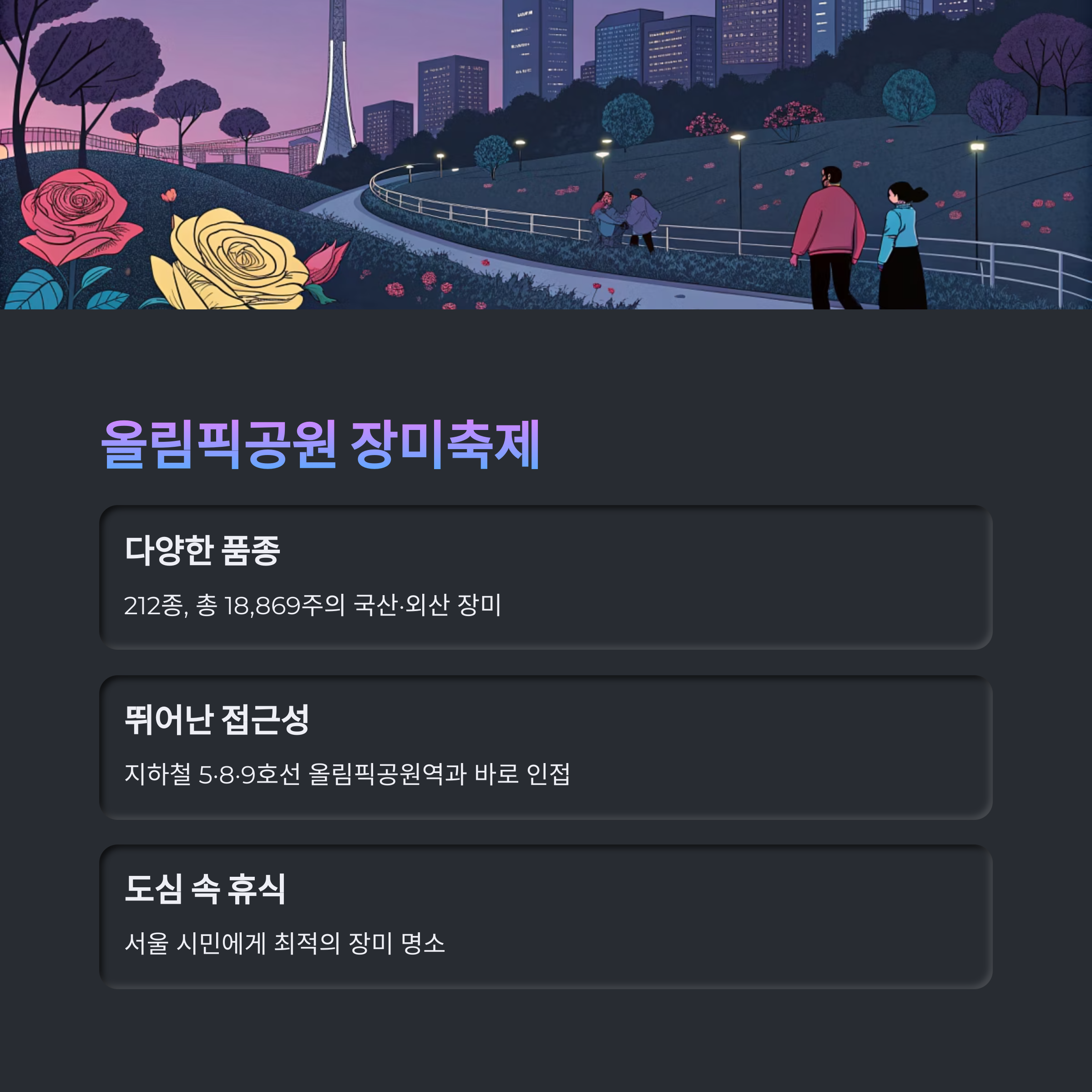 도심 한복판에서도 장미의 우아함을 누릴 수 있다는 점에서 서울 시민에게 최적의 명소입니다.