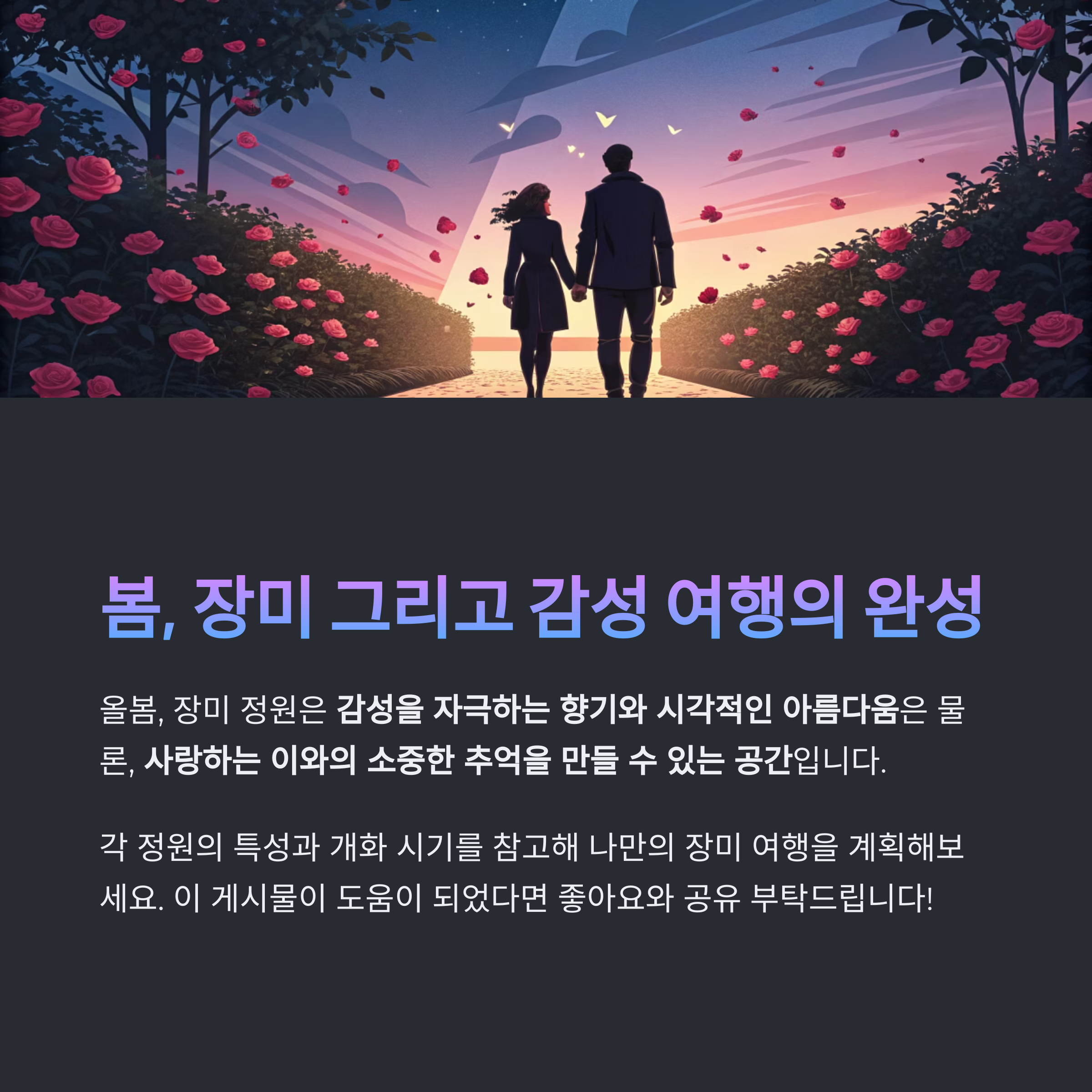 각 정원의 특성과 개화 시기를 참고해, 나만의 장미 여행을 계획해보시기 바랍니다.