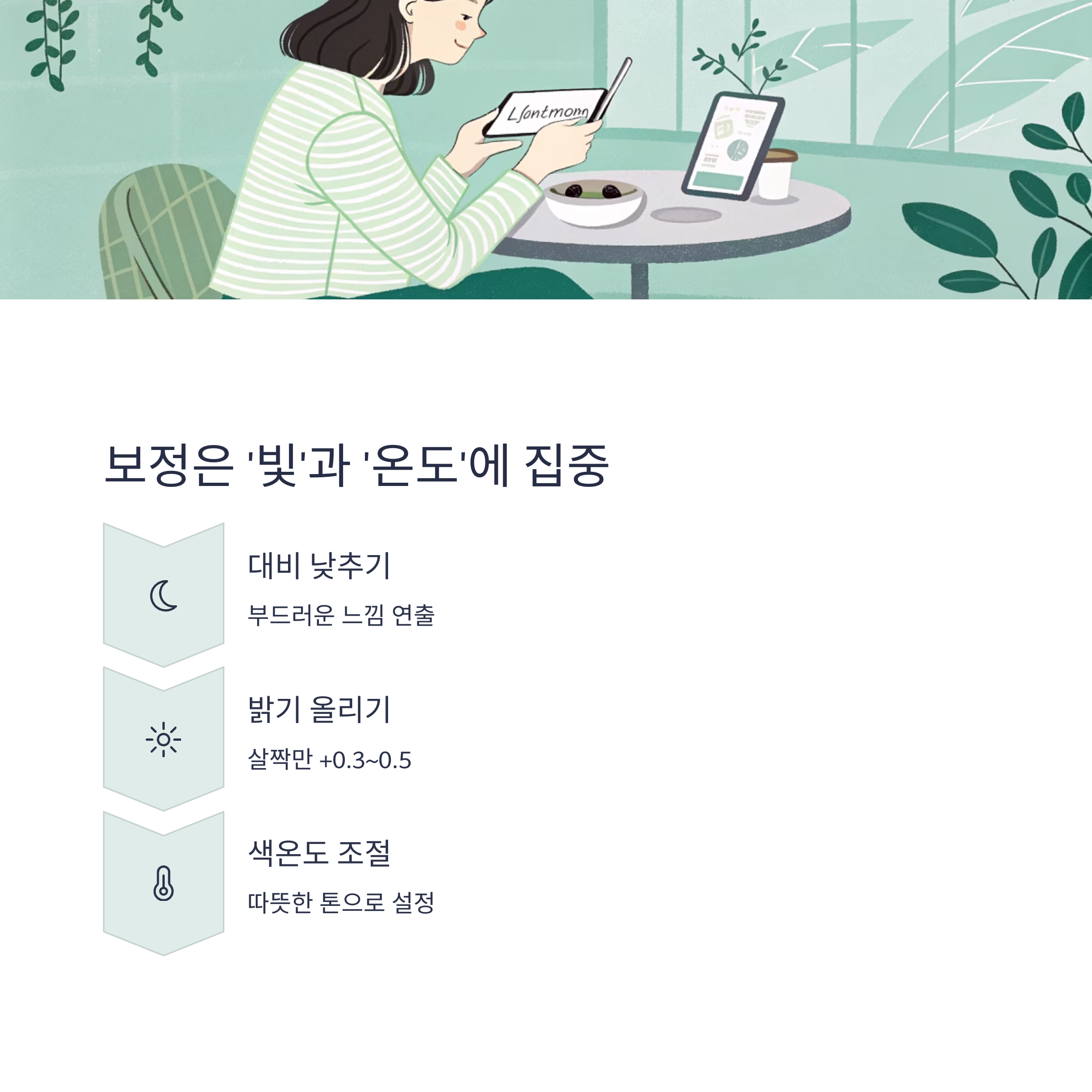 대비는 낮추고, 밝기를 살짝 올려 부드럽게 표현하세요.