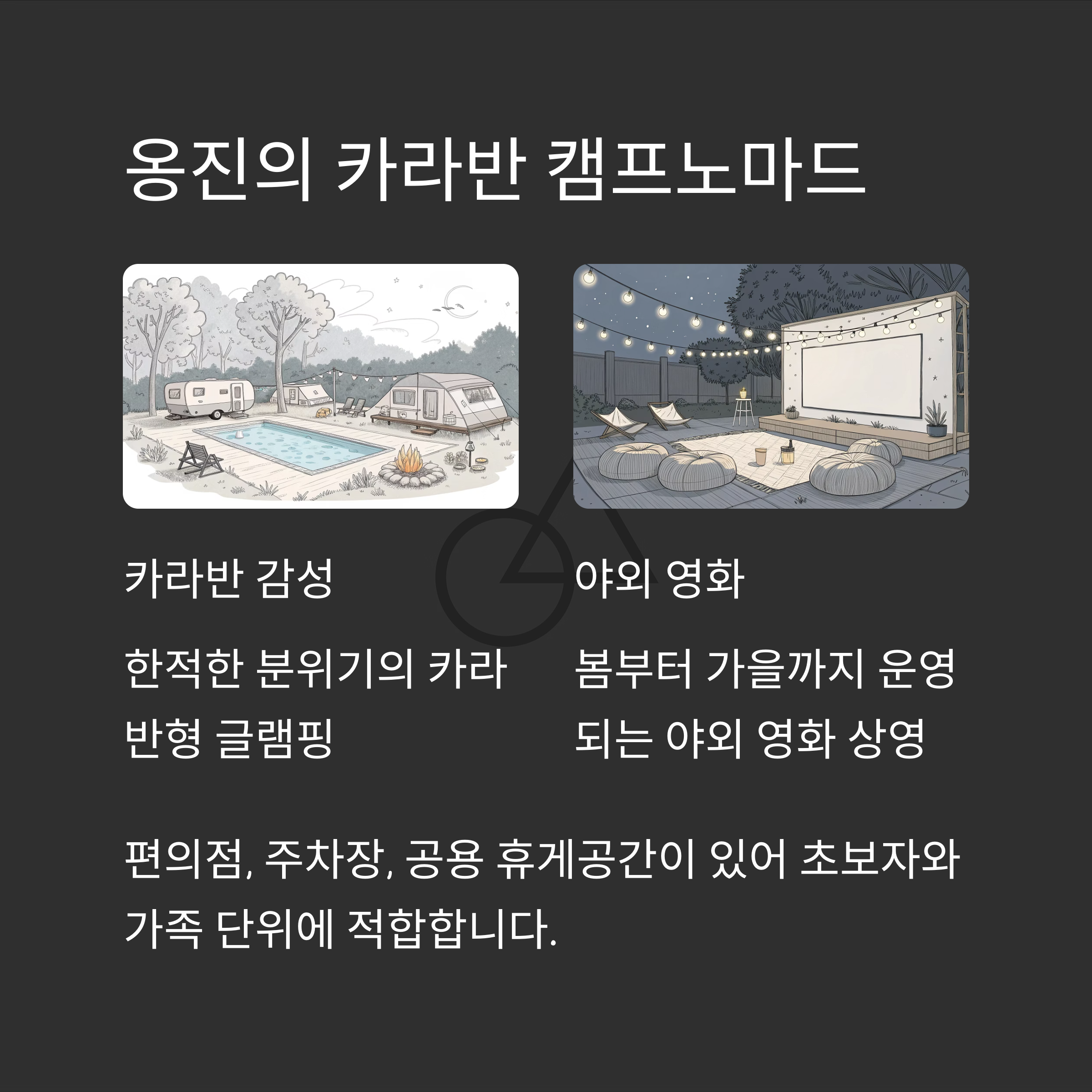 봄과 가을에는 산책과 계곡 힐링, 여름엔 풀장과 바비큐, 겨울엔 온돌방에서 아늑한 힐링까지 가능한 사계절형 글램핑장입니다.