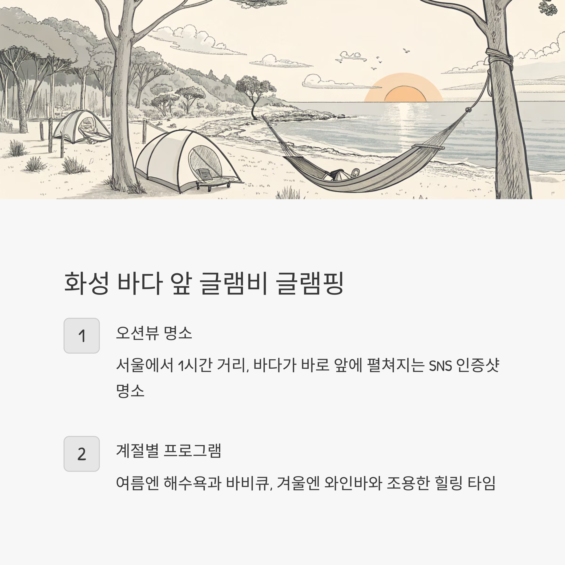 서울에서 1시간 남짓, 바다가 바로 앞에 펼쳐지는 글램비 글램핑은 화성 서신면에 위치한 오션뷰 명소입니다. 신축급 시설과 감성적인 분위기로 최근 SNS 인증샷 명소로 각광받고 있습니다.
