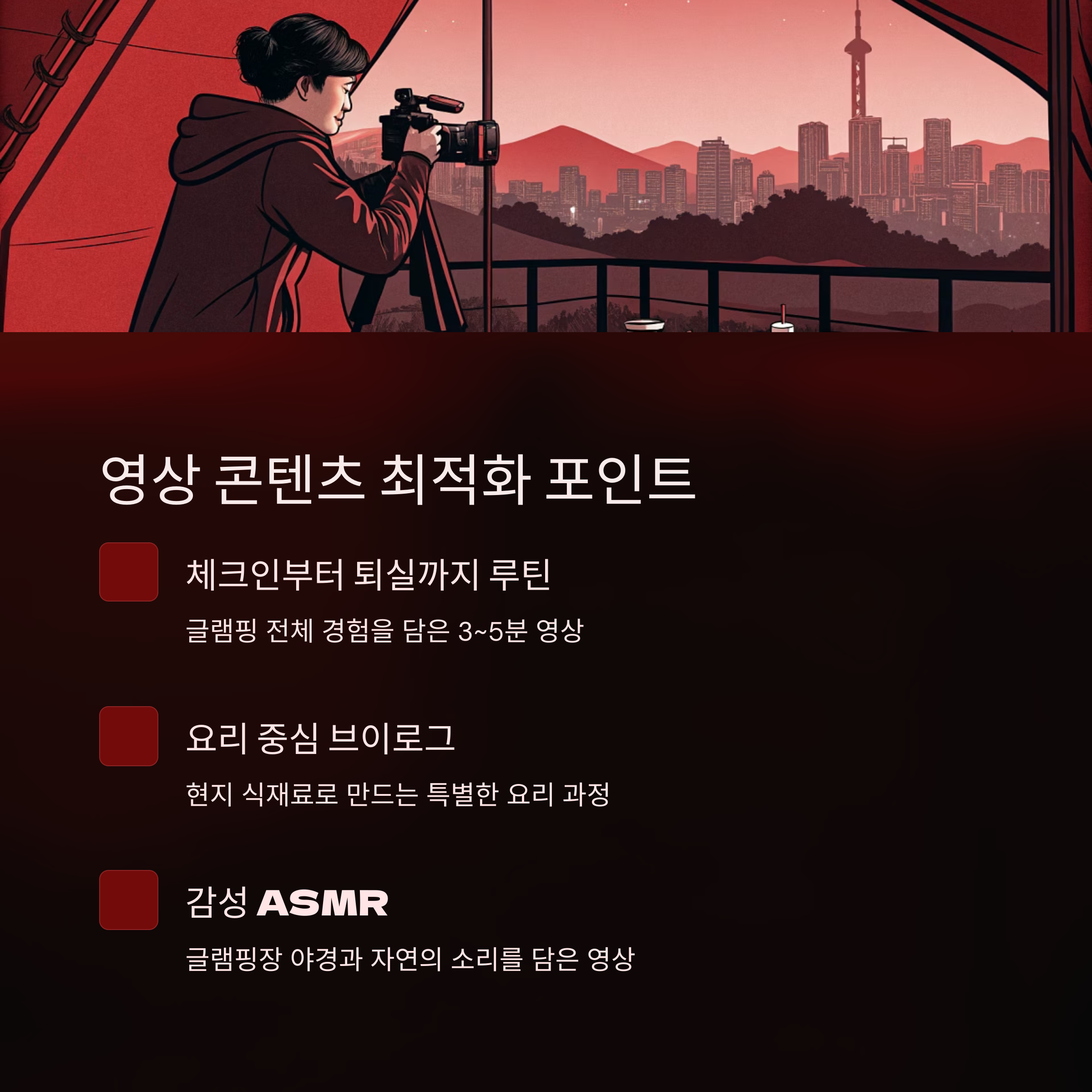 1인 브이로그, 리얼 캠핑 후기, ASMR 콘텐츠 등