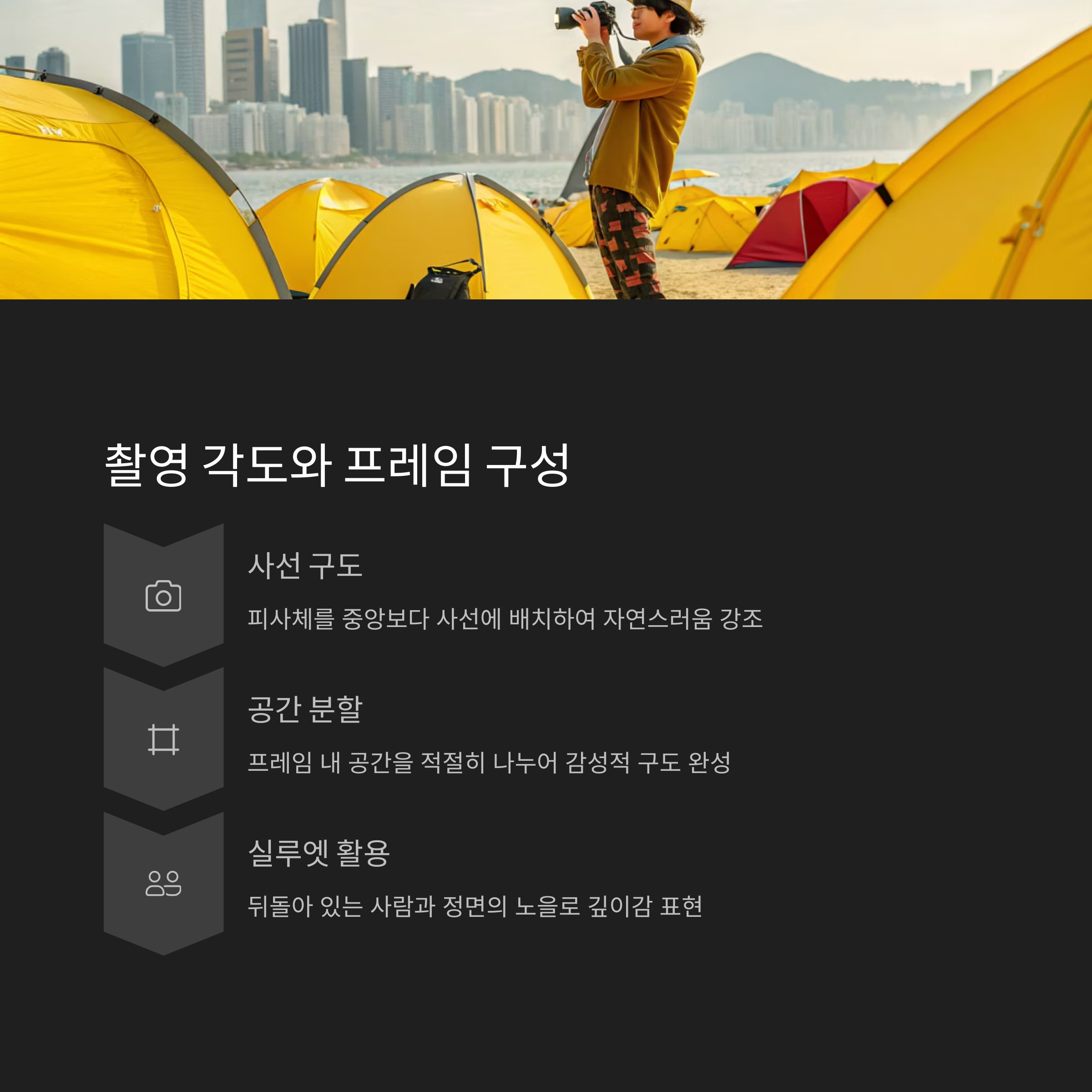 피사체를 중앙에 두는 구도보다는 사선, 측면, 프레임 내 공간 분할을