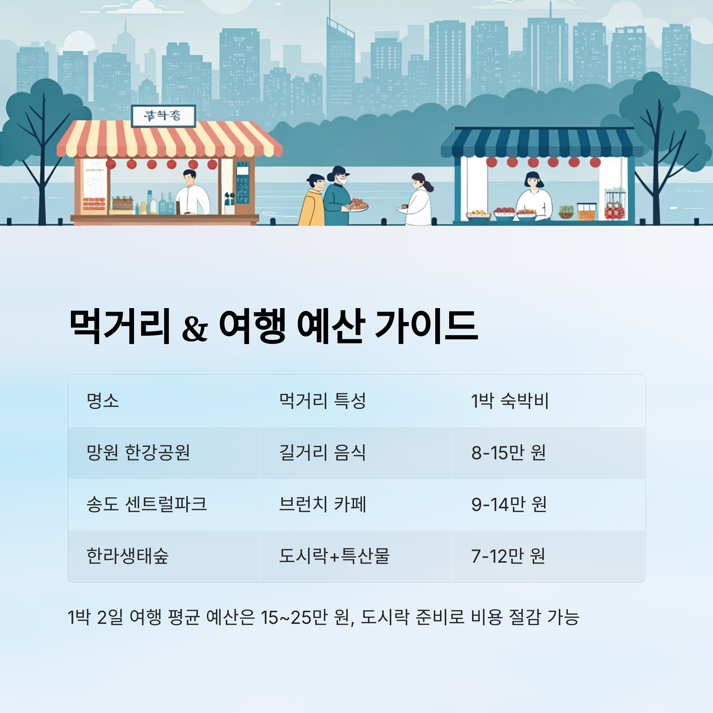| 망원 한강공원 | 길거리 음식(떡볶이, 튀김, 김밥) | 8~15만 원 | 3~5만 원 |