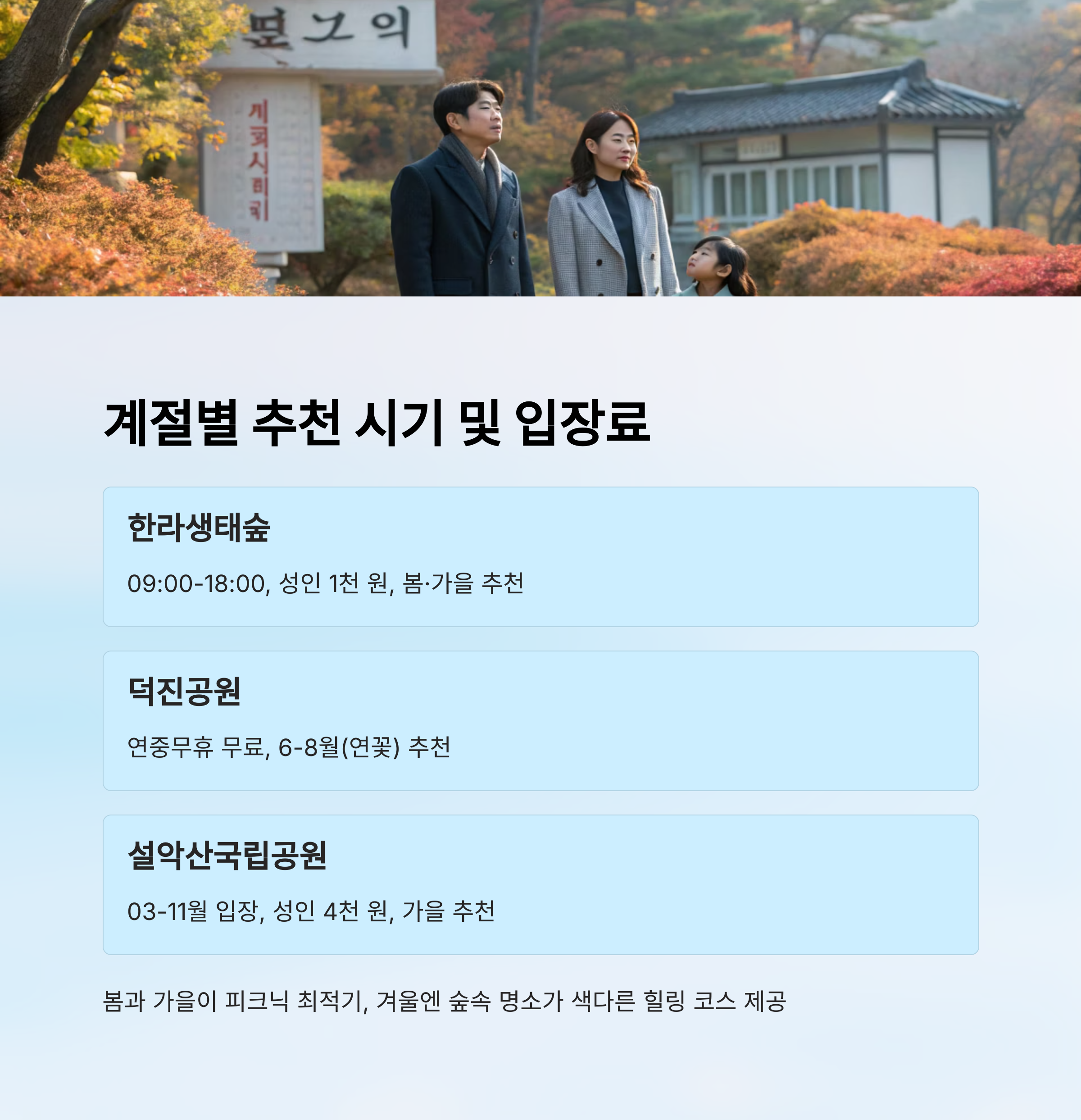 단, 제주 한라생태숲은 유료 운영 중이며 계절별 특징이 뚜렷합니다.