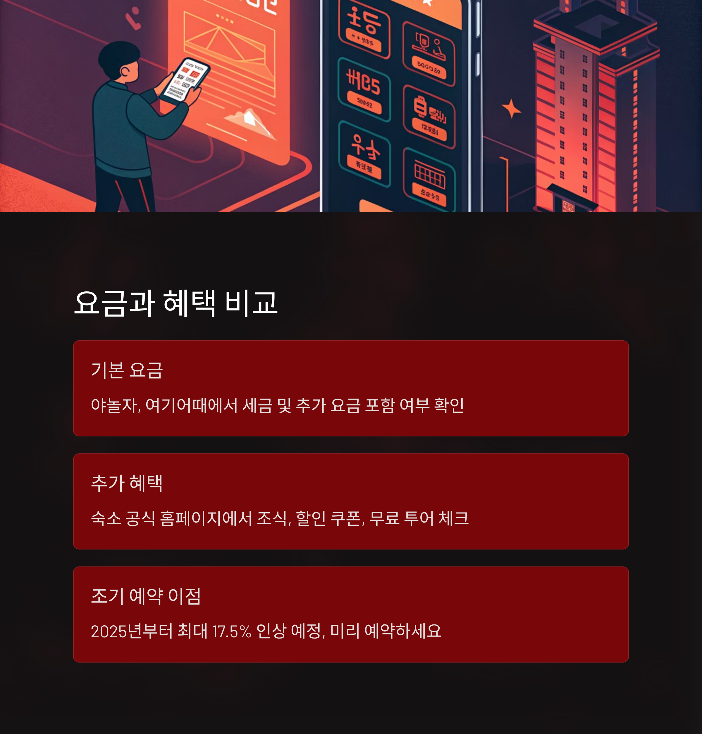 | 기본 요금 | 야놀자, 여기어때 | 세금, 추가 요금 포함 여부 |