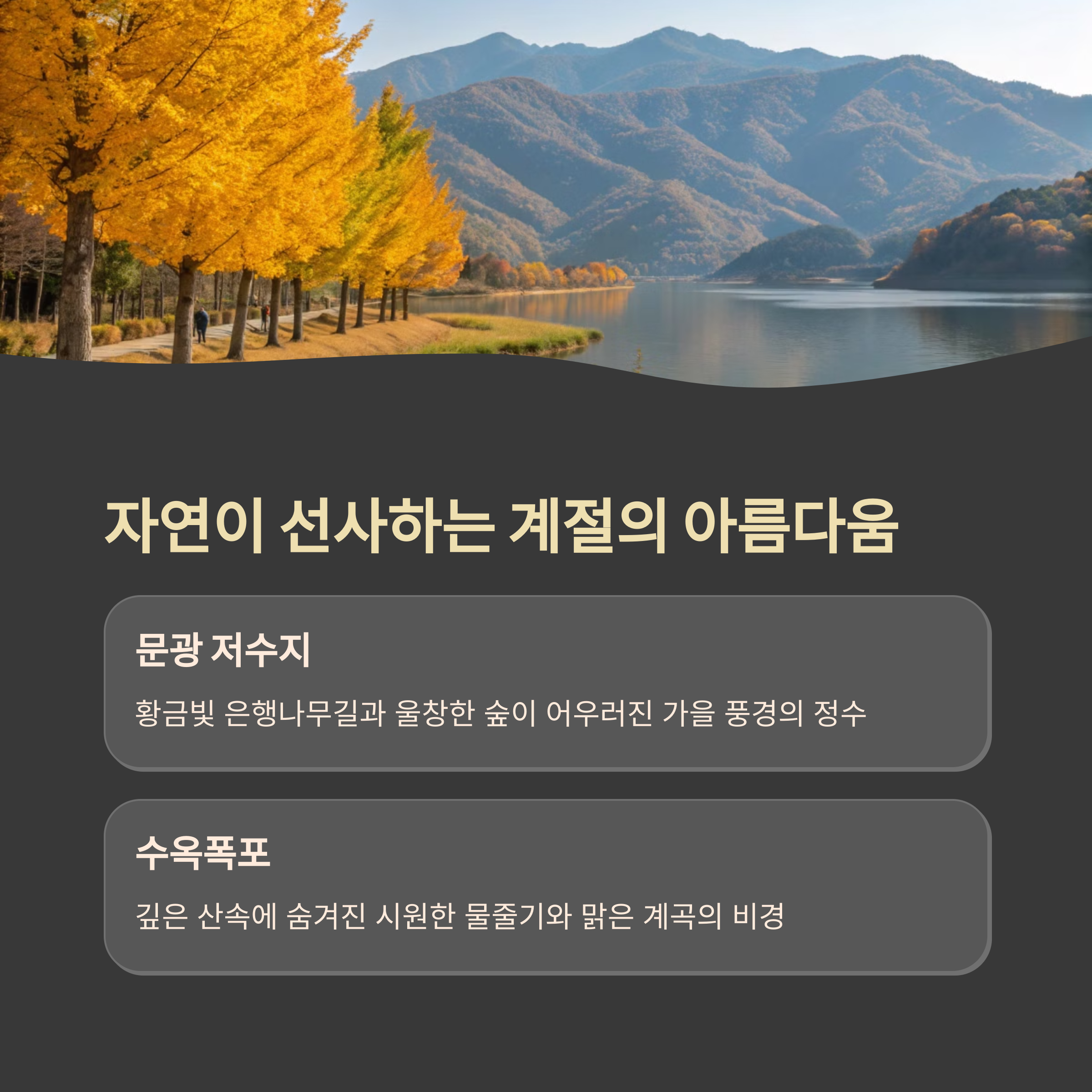 | 경관조명, 미디어파사드, 수국 정원 | 괴산호, 구름다리, 자연 산책로 | 은행나무길, 숲, 낚시터 |