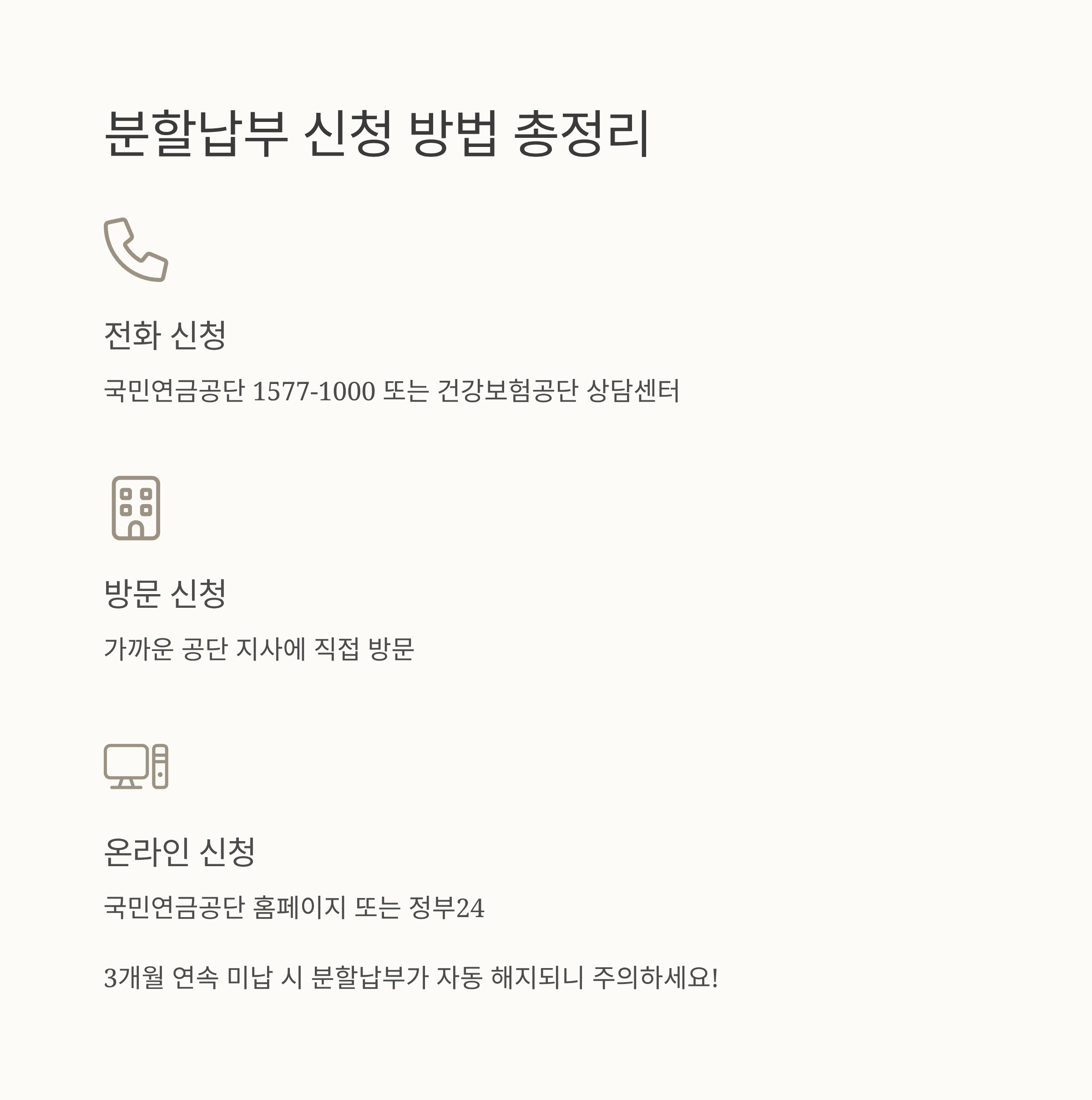 - 전화 신청: 국민연금공단 1577-1000 또는 건강보험공단 상담센터