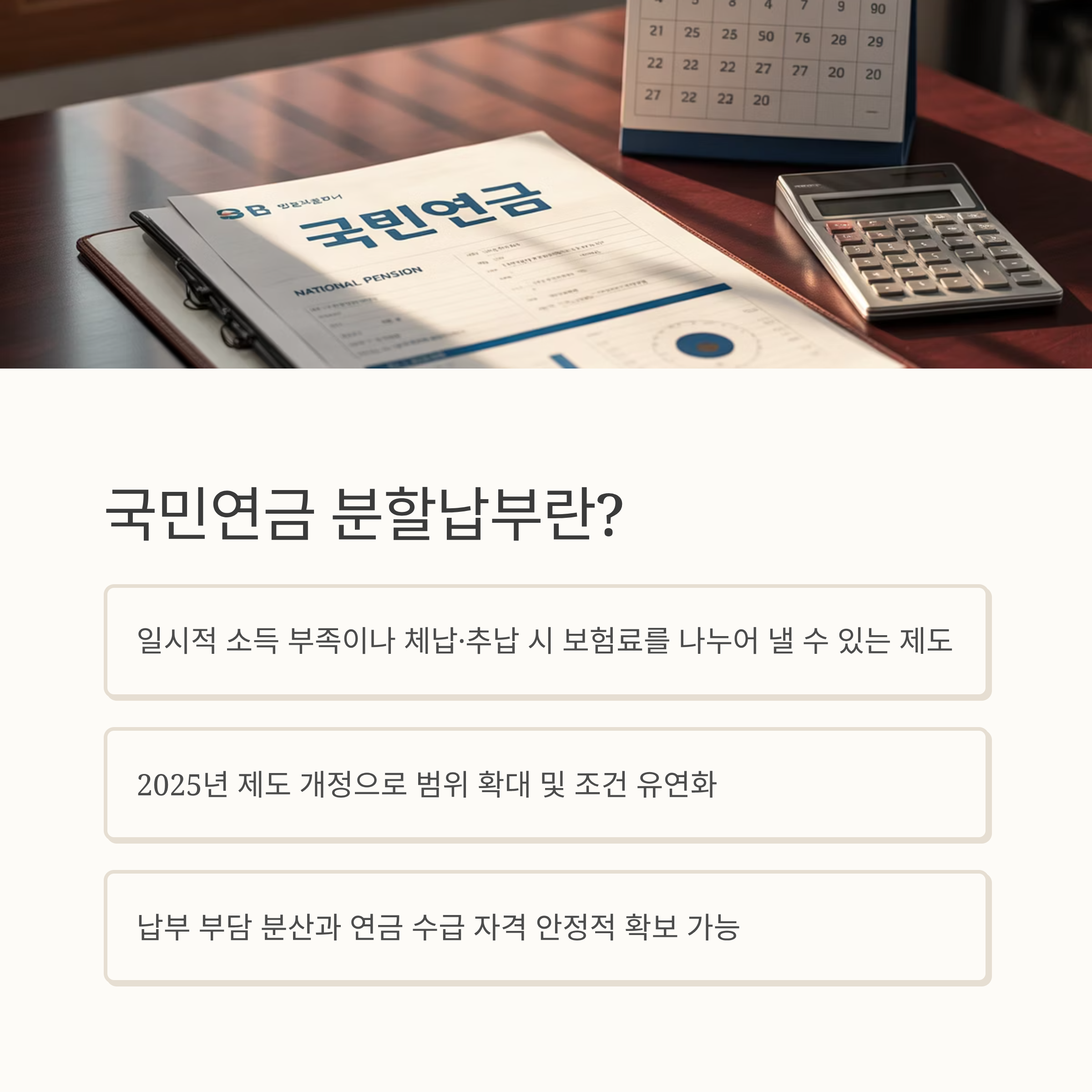 국민연금 분할납부는 일시적 부담을 줄이며 미래를 준비하는 가장 현실적인 제도입니다.
