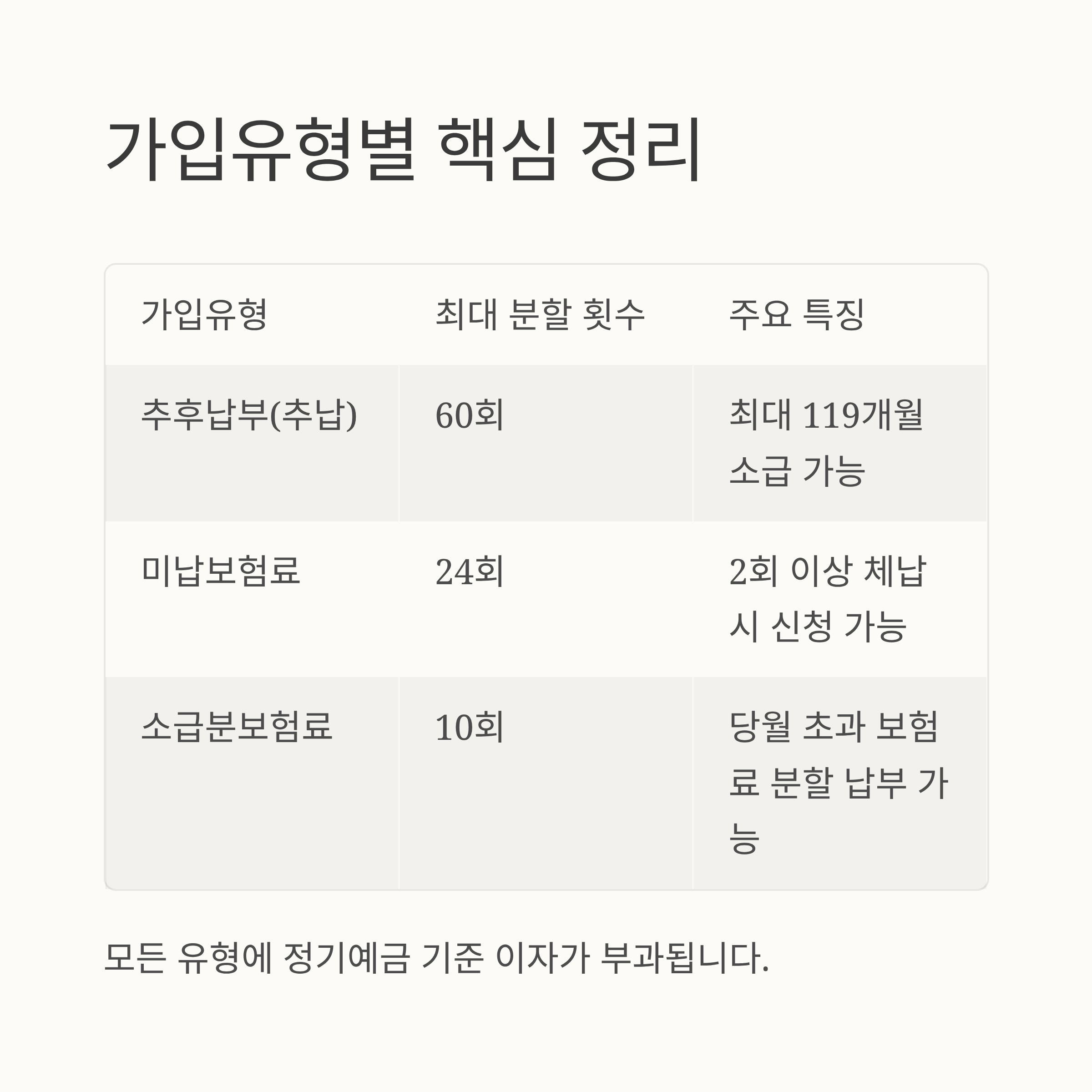 가입유형 최대 분할 횟수 이자 부과 여부 주요 특징