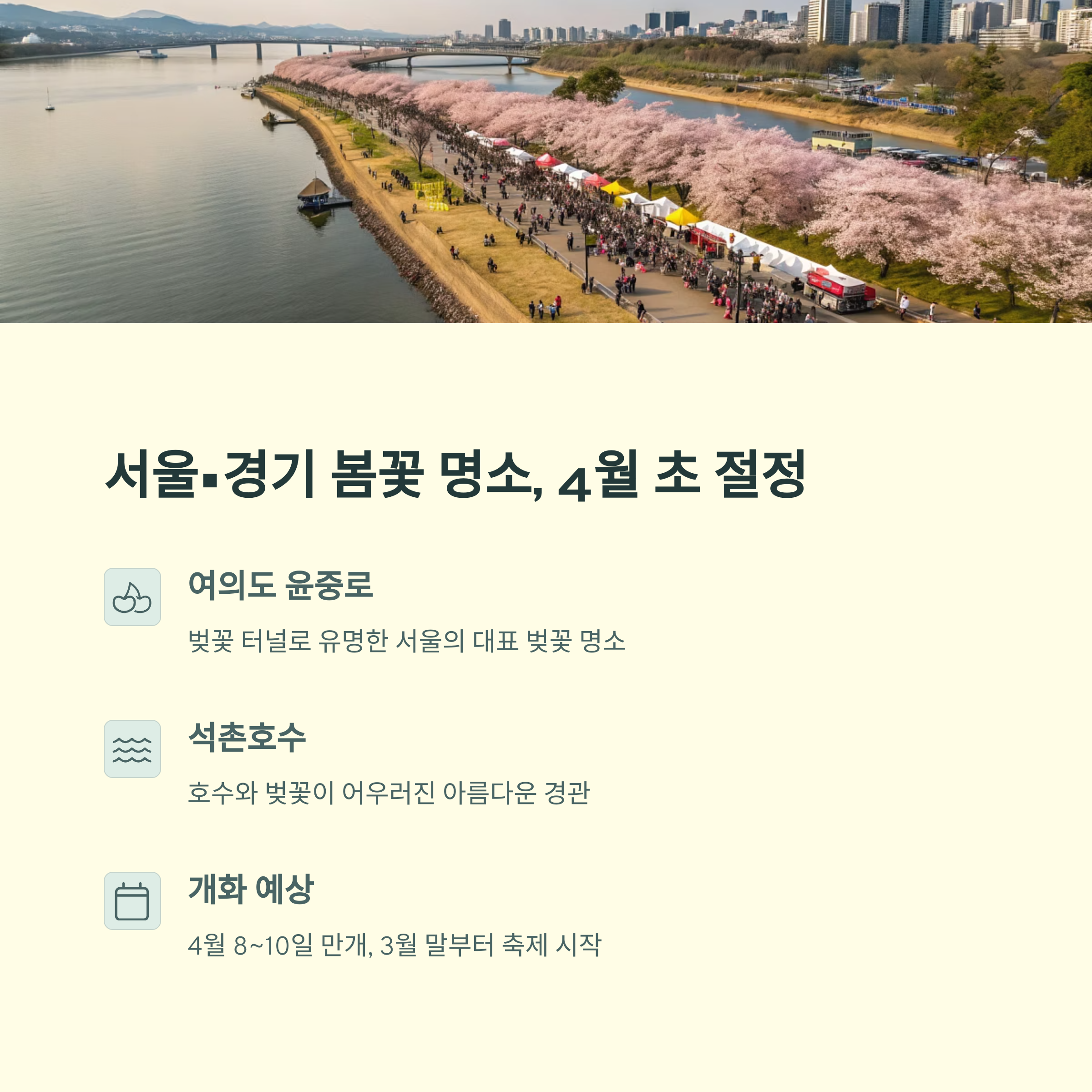 📌 서울 벚꽃 개화 시기: 4월 1일 개화 예정, 4월 8일경 절정