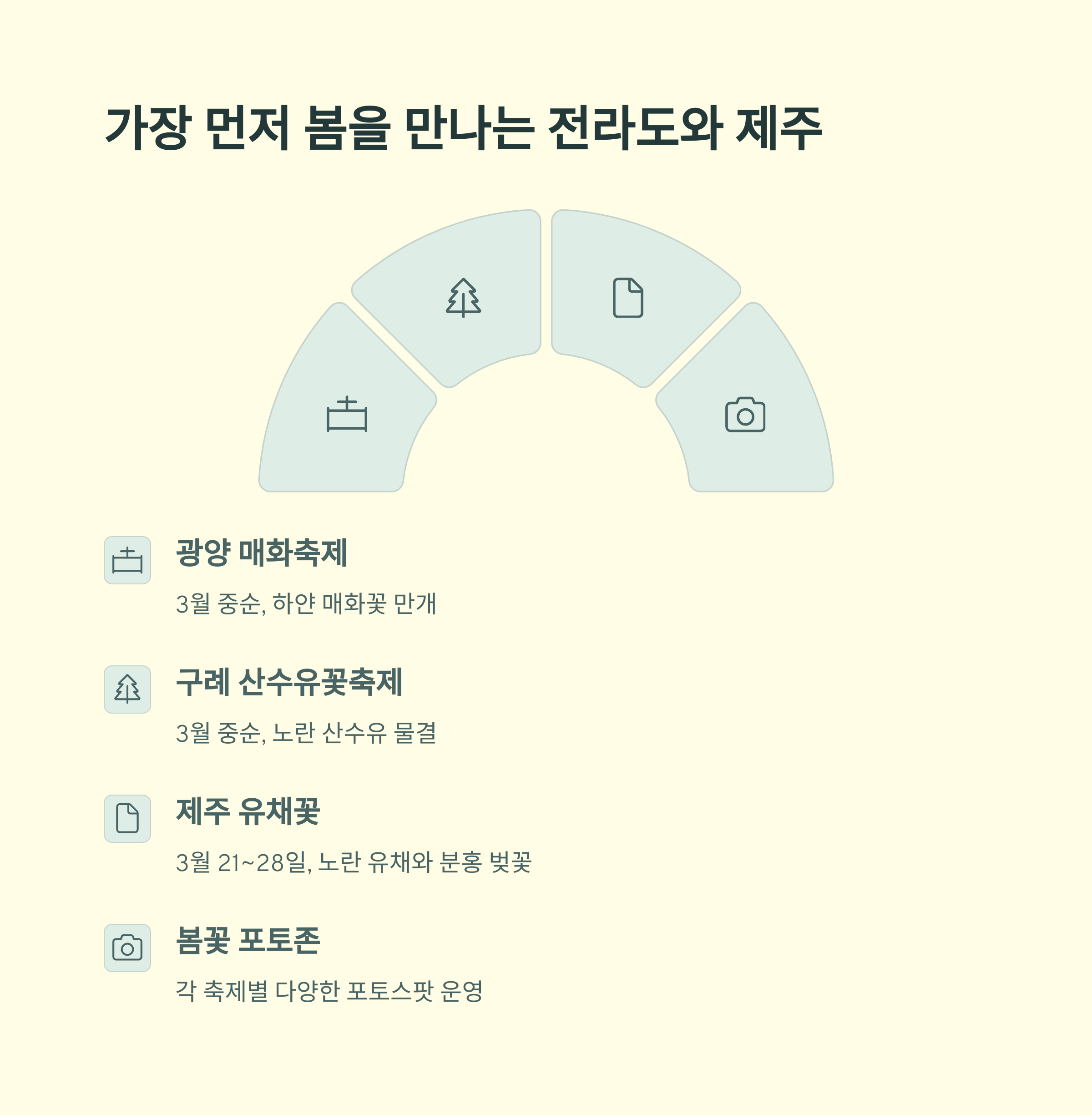전라도는 매화, 산수유, 벚꽃 등 다양한 봄꽃을 즐길 수 있는 명소가 많습니다. 특히 3월 초부터 시작되는 매화 축제는 봄의 시작을 알리는 대표적인 행사예요.