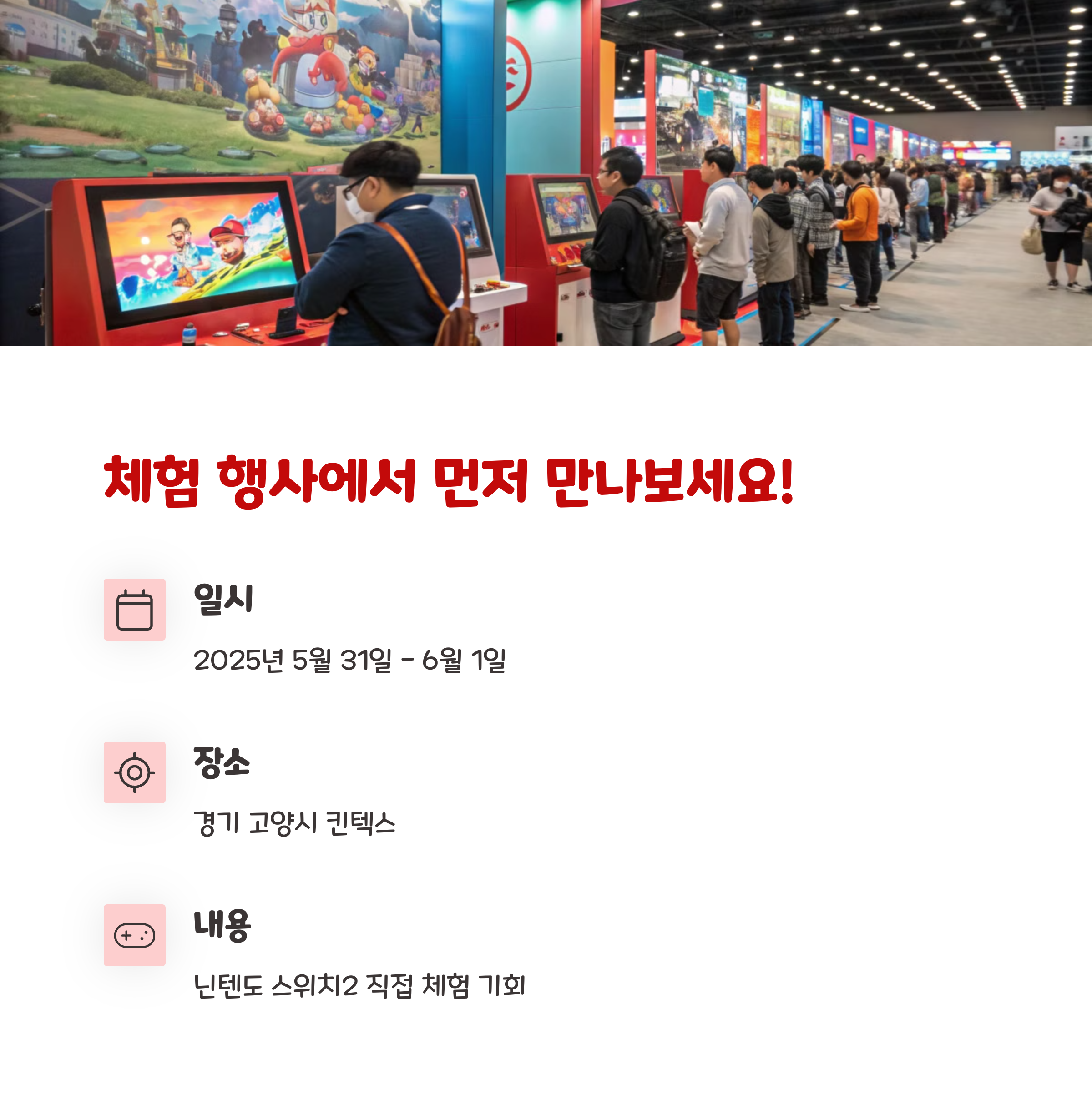 닌텐도는 5월 31일부터 이틀간 고양시 킨텍스에서 체험회를 개최할 예정입니다. 직접 체험해보고 구매를 결정하는 것도 좋은 방법입니다.