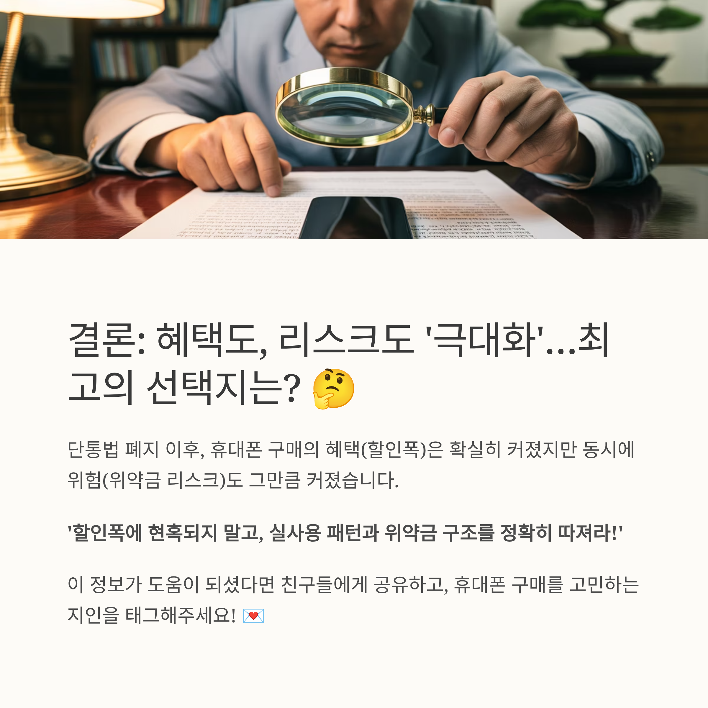 단통법 폐지 이후, 휴대폰 구매의 혜택(할인폭)은 확실히 커졌습니다. 하지만 동시에 위험(위약금 리스크)도 그만큼 커졌다는 사실을 절대 잊어서는 안 됩니다.