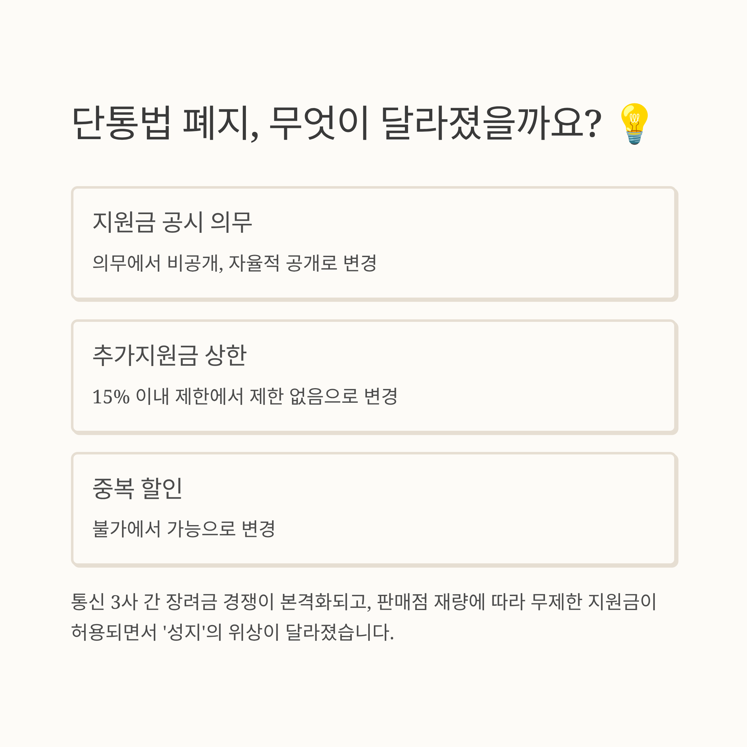 결국, 2025년 7월에 보조금 상한선 없애기, 통신사의 지원금 공시 의무 폐지, 번호이동·신규가입 혜택 차별 허용, 그리고 선택약정 할인과 단말기 할인 중복 수령 가능이라는 네 가지 핵심 변화를 앞세워 단통법이 공식 폐지된 거죠.