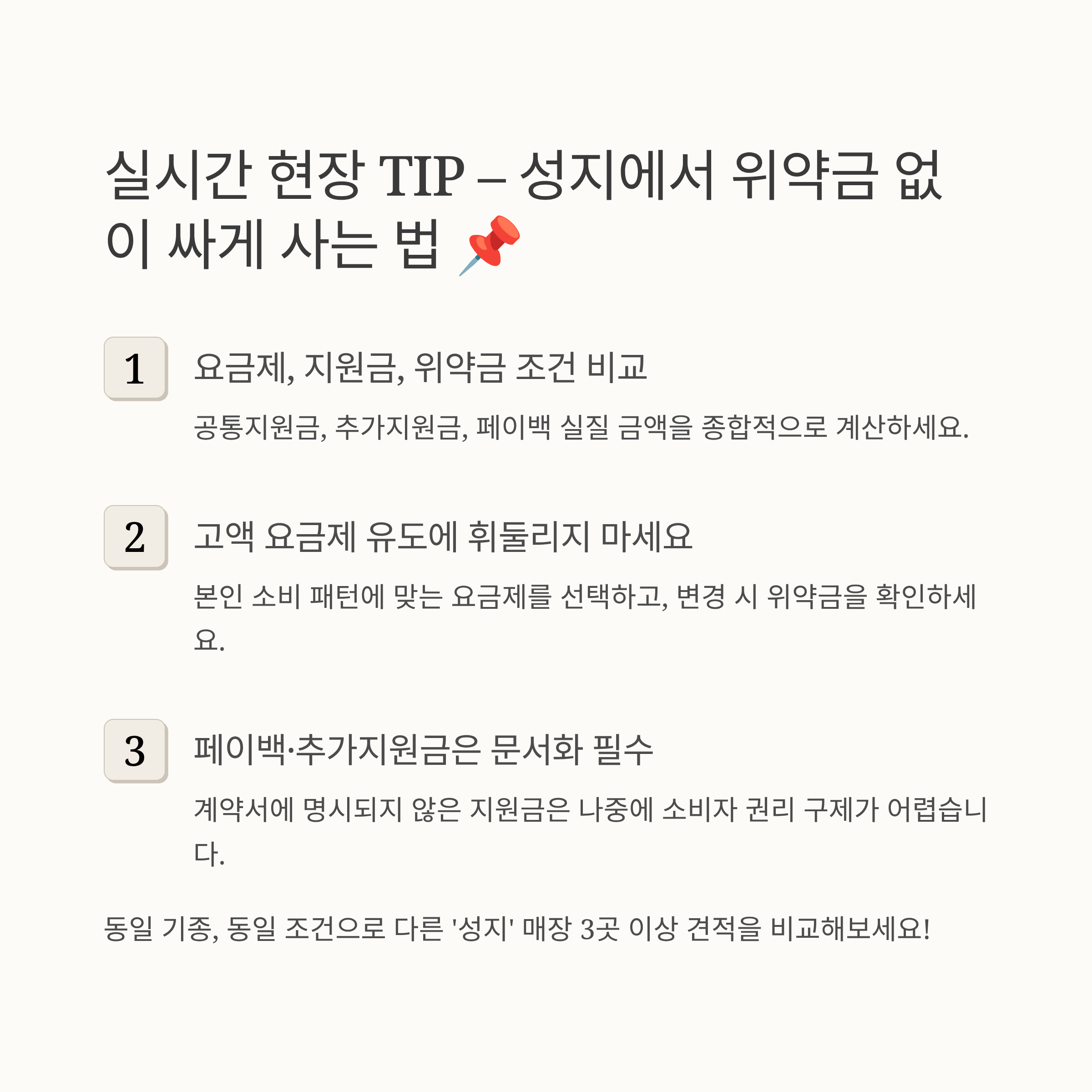 - 계약서에 명시되지 않은 지원금(현금, 쿠폰, 카드 등)은 나중에 위약금 산정 대상이 아니더라도 소비자 권리 구제가 어려울 수 있습니다. 꼭 문서로 남겨두세요!
