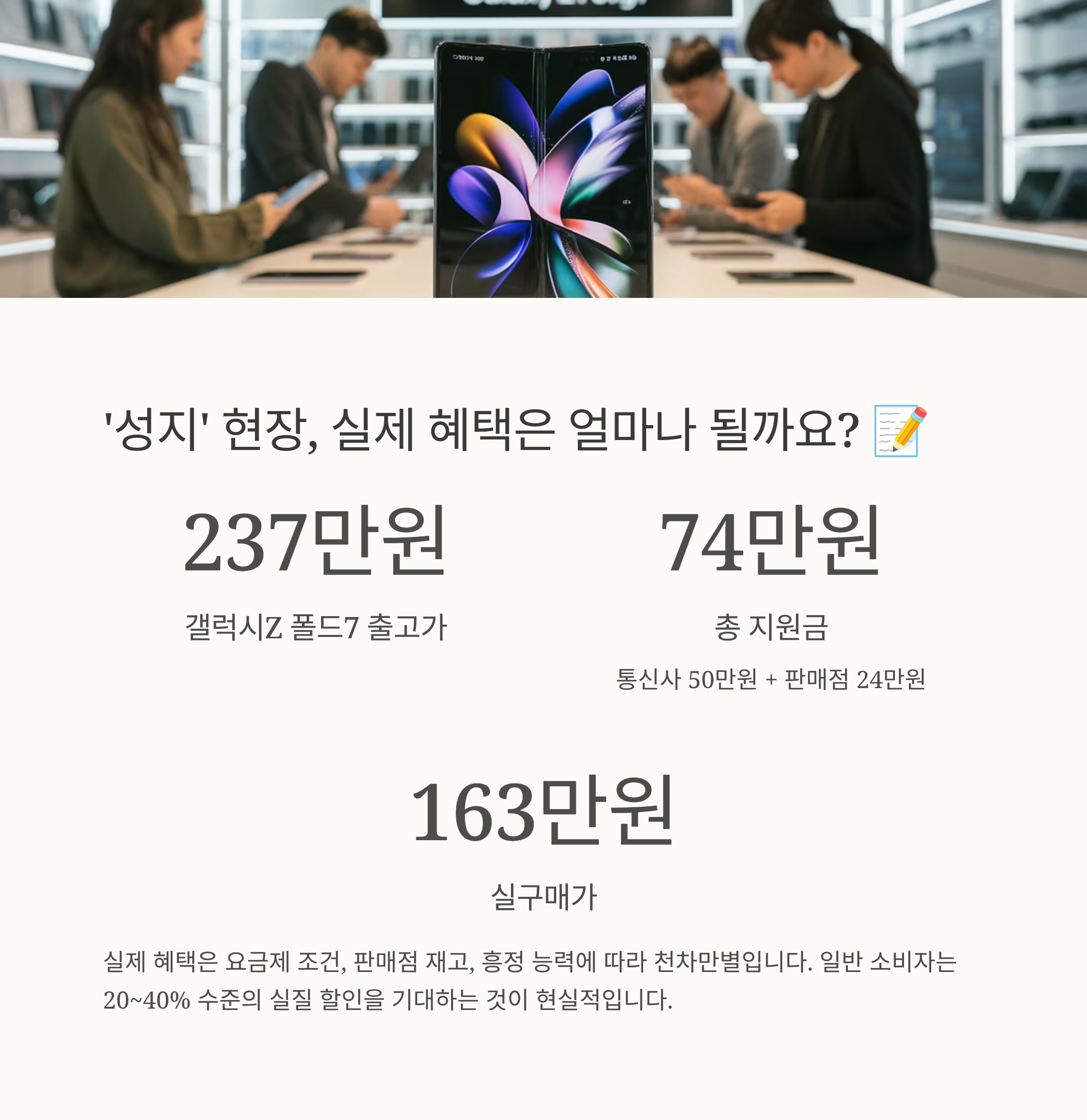 근데 막상 현장에서 소비자들 이야기를 들어보니, 기대와는 좀 다른 현실도 있었어요. 법 폐지 직전보다는 지원금 규모가 확실히 커진 건 맞는데, '공짜폰'이 다시 돌아왔다는 건 대다수에게는 좀 환상에 가까운 이야기 같더라고요. 어떤 소비자분은 “갤럭시Z 폴드7 사러 왔는데 생각만큼 싸지 않네요. 2~3개월 뒤에 다시 와봐야겠어요.”라고 실망감을 드러내기도 했습니다.