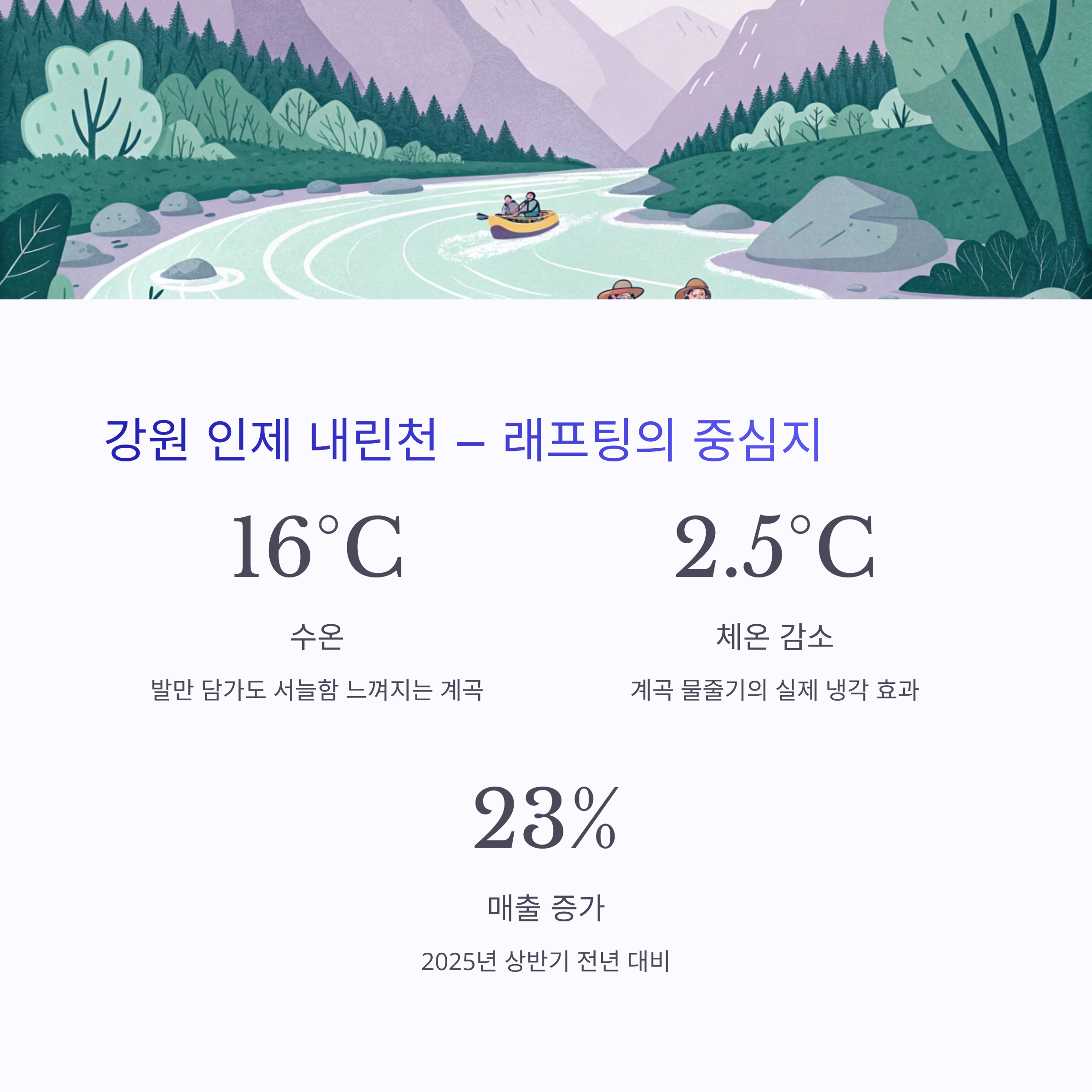 내린천은 여름철 체온을 빠르게 낮출 수 있는 대표적 장소입니다.