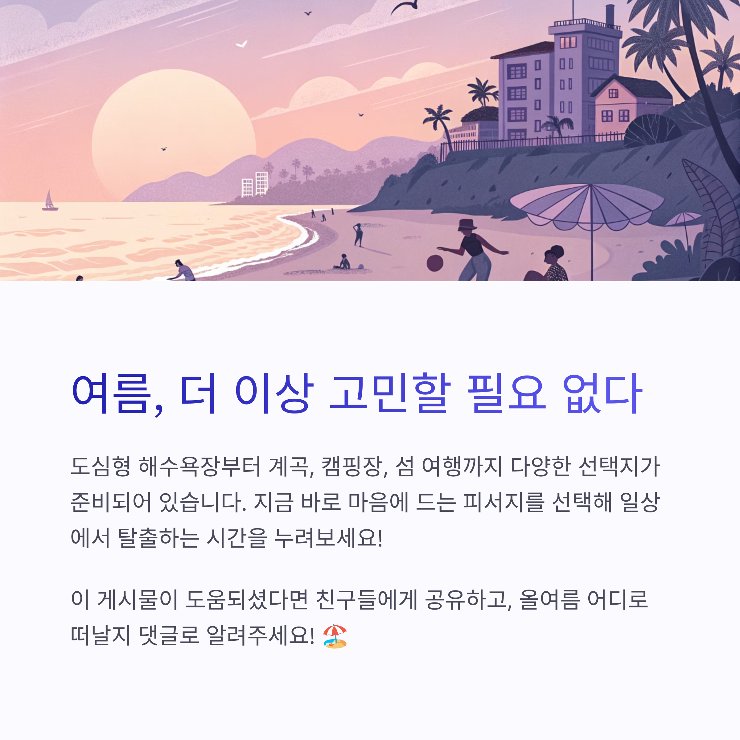 여름이면 찾아오는 폭염에 대비해, 2025년 꼭 가야 할 국내 피서지 5곳을 정리했습니다. 가족 단위는 물론, 친구, 연인, 혼자 떠나는 여행객까지 만족할 수 있는 장소들로, 실시간 데이터와 최신 트렌드를 바탕으로 선정했습니다. 체온을 내려줄 청량감, 자연과의 교감, 그리고 도시에서의 탈출까지. 지금 바로 이 다섯 곳 중 한 곳으로 여름을 피하러 떠나보세요.