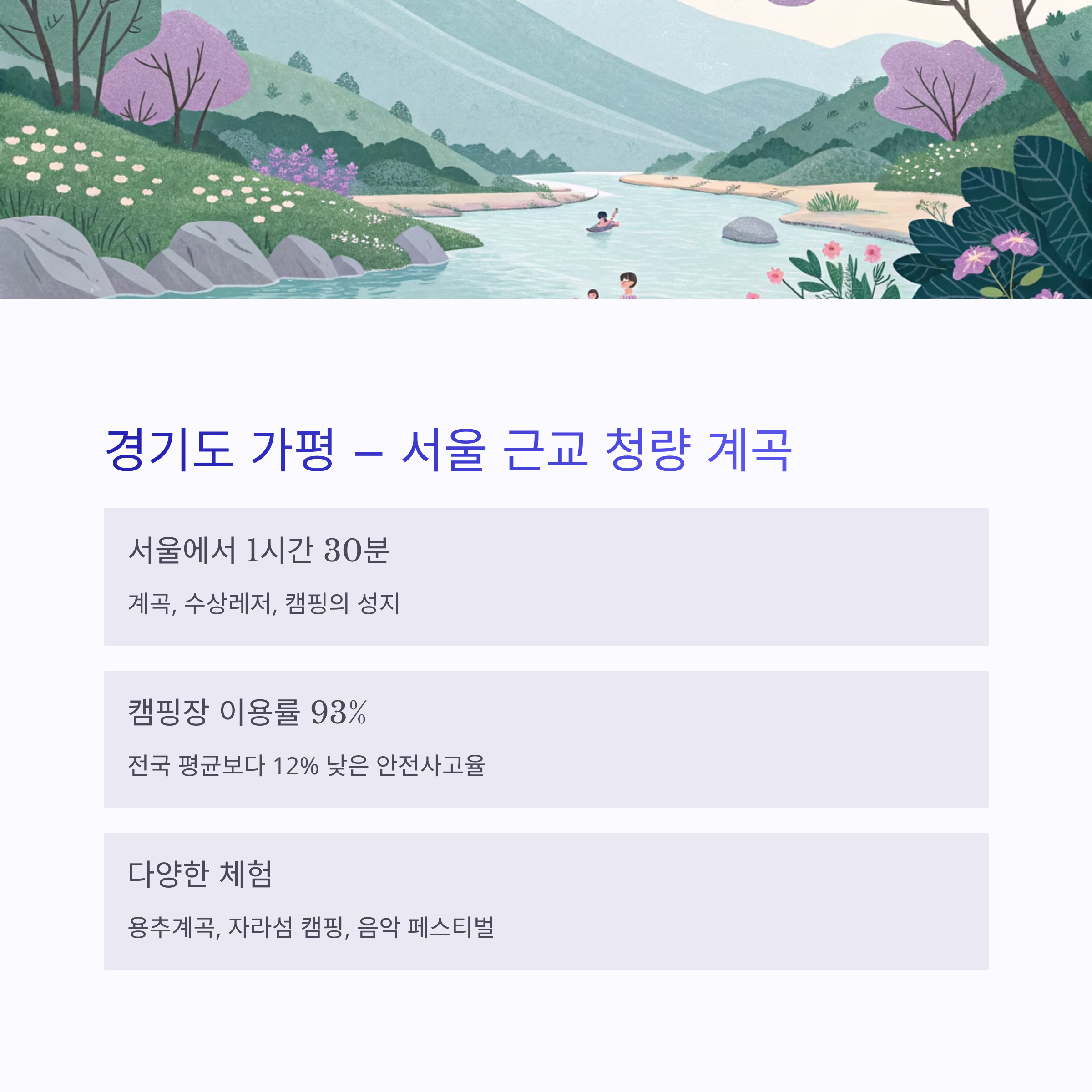 | 인기 활동 | 래프팅, 캠핑, 글램핑 |