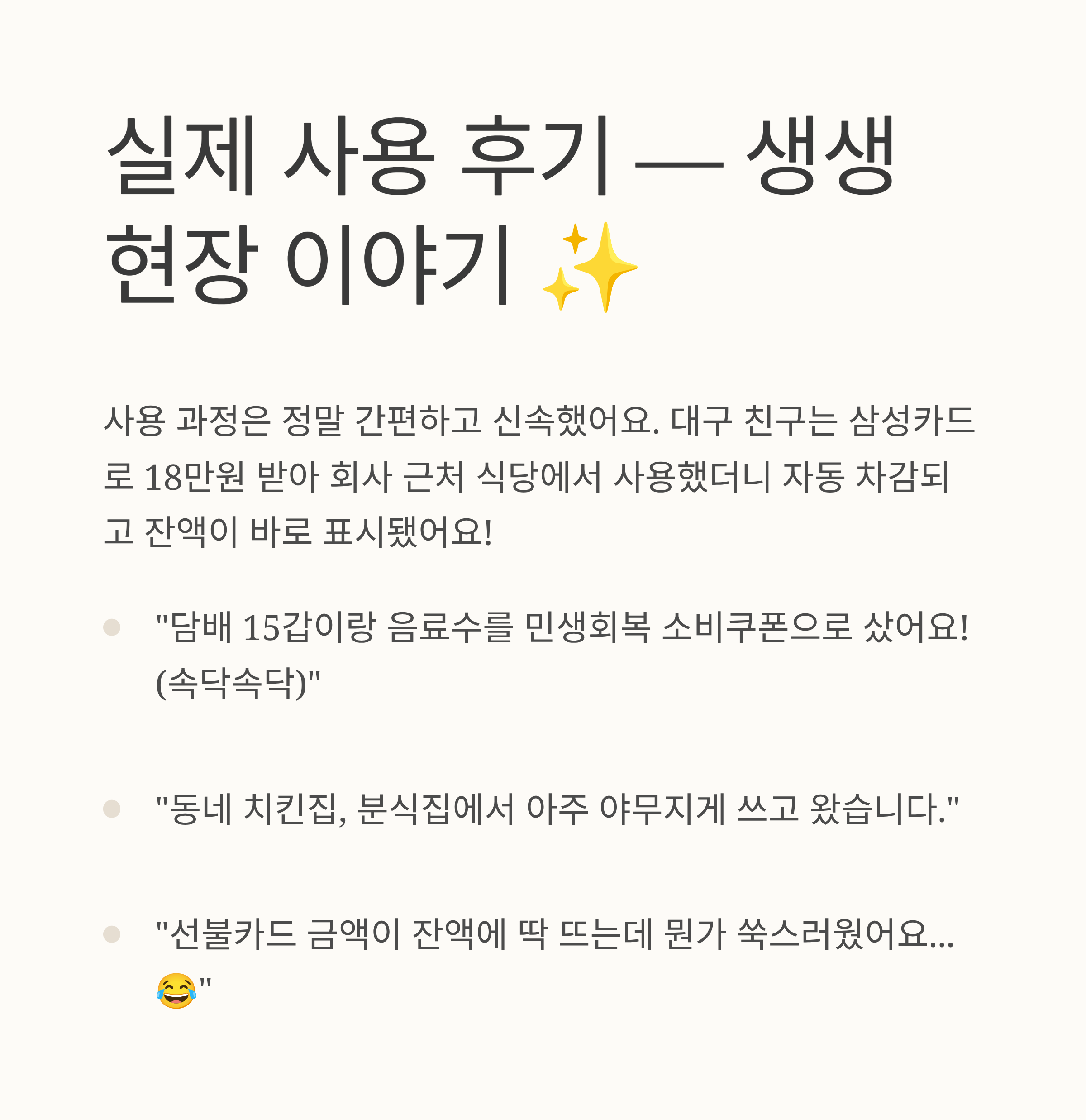 - 실제 사용 경험: 결제 과정 간편, 자동 차감, 기존 카드 혜택 중복 적용 가능. 대구 A씨 사례처럼 추가 할인 혜택으로 체감 효과 극대화.