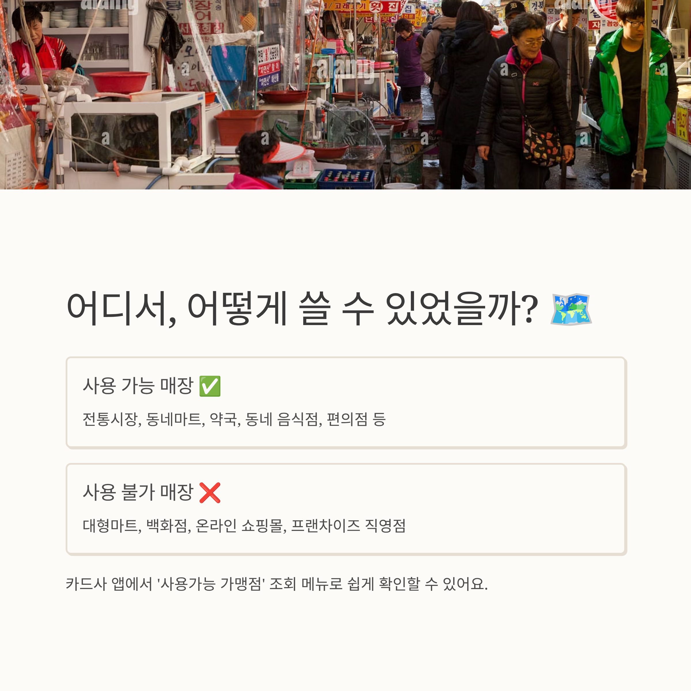 - 사용처의 특이점: 영세 소상공인 보호를 위해 연매출 30억원 이하 매장에서만 사용 가능. 대형마트, 백화점, 온라인몰 등은 제외. 카드사 앱에서 가맹점 확인 필수!