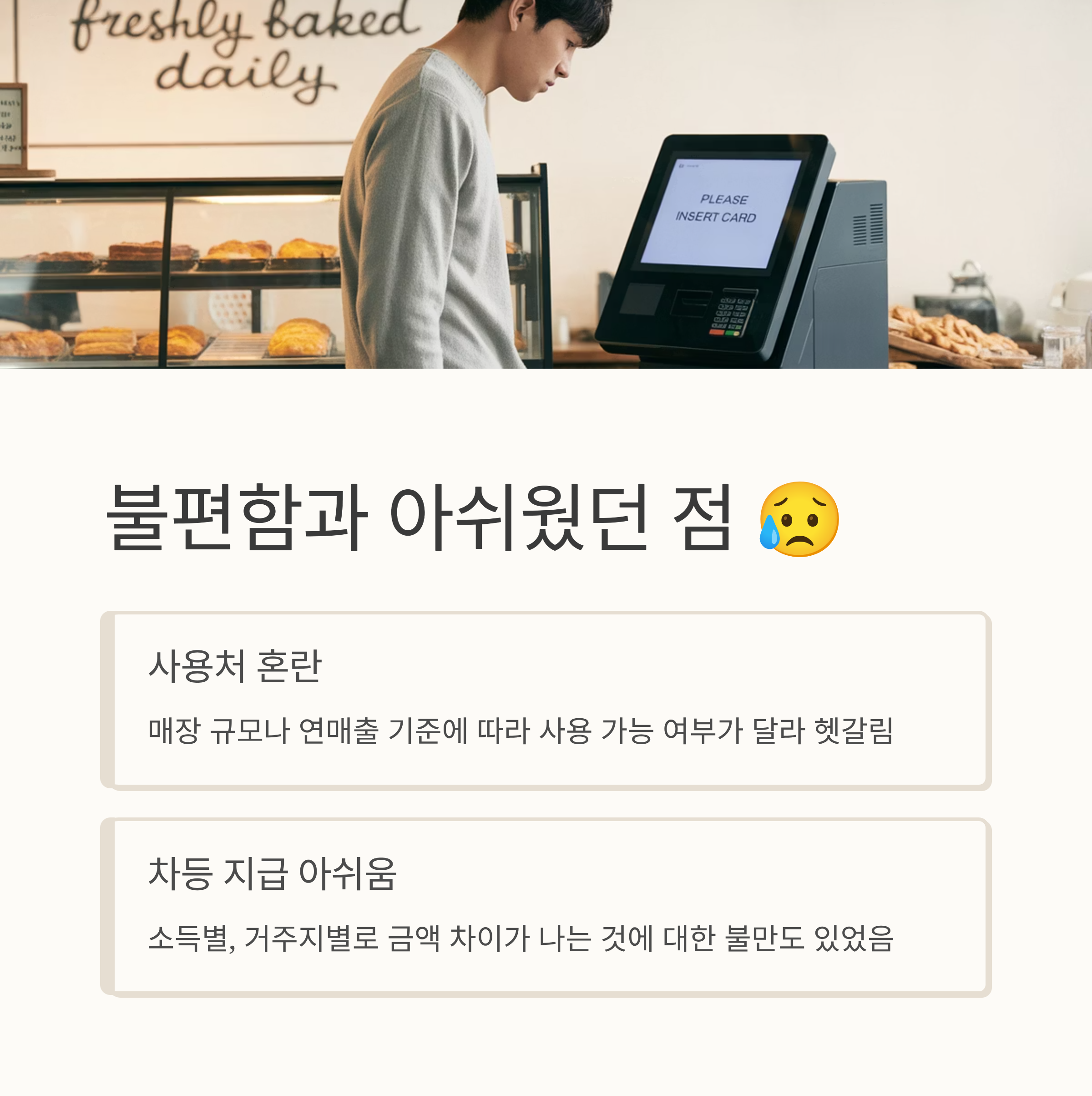 물론 아쉬운 점도 있었죠. 여전히 사용처가 헷갈린다는 불만은 좀 있었어요. 매장 규모나 연매출 기준에 따라 사용 가능 여부가 갈리다 보니, 어떤 자영업자분들은 본인 매장이 되는지 안 되는지 정확히 모르는 경우도 있더라고요.