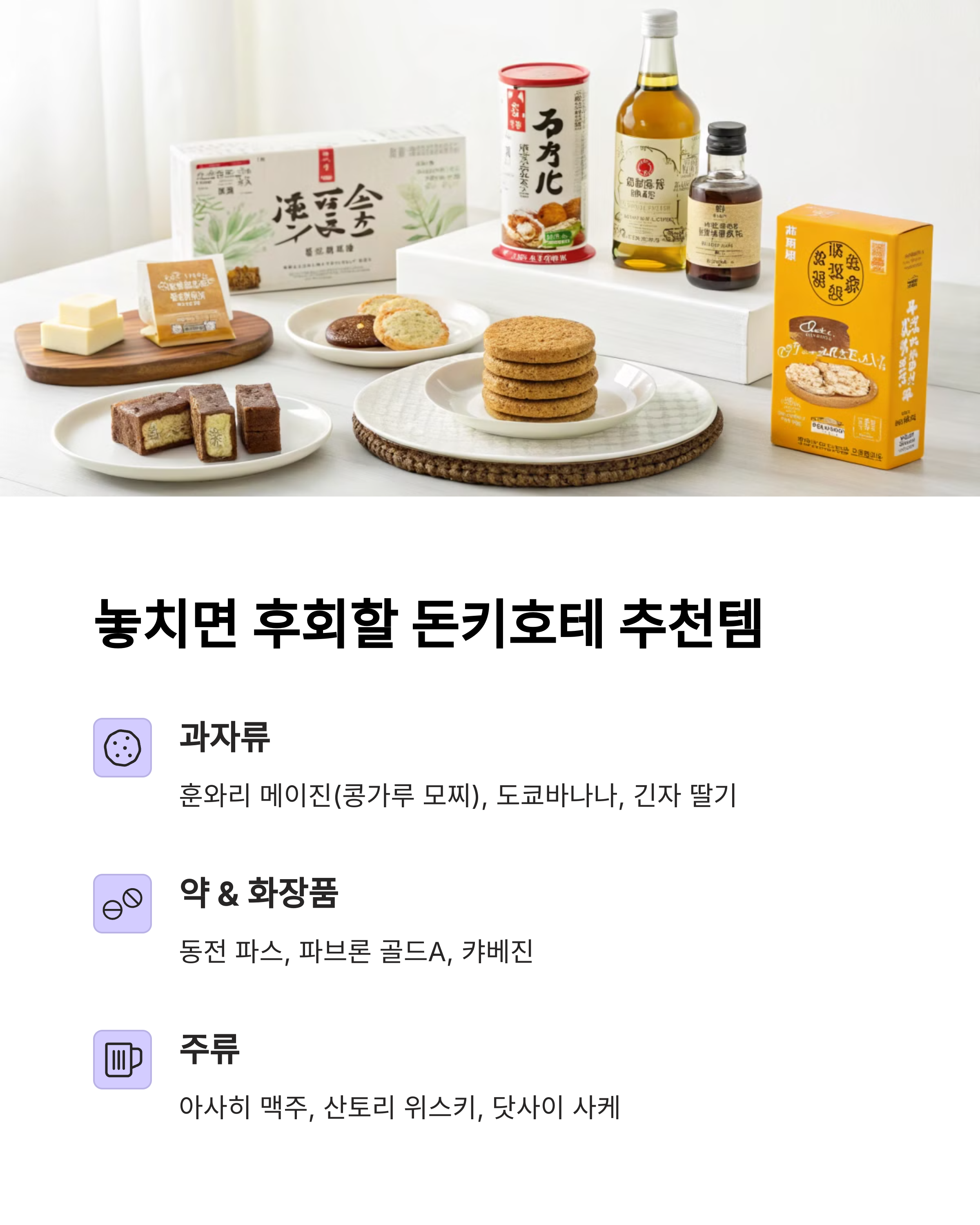 또한 일본 여행에서의 주류도 추천 제품에 포함됩니다. 아사히, 삿포로 맥주, 산토리 위스키, 닷사이 사케와 같은 일본 대표 주류는 기념품으로도 훌륭하며, 현지 문화를 경험할 수 있는 멋진 방법입니다. 돈키호테에서 이들 주류를 할인된 가격으로 구입할 수 있는 기회는 놓치지 마세요.