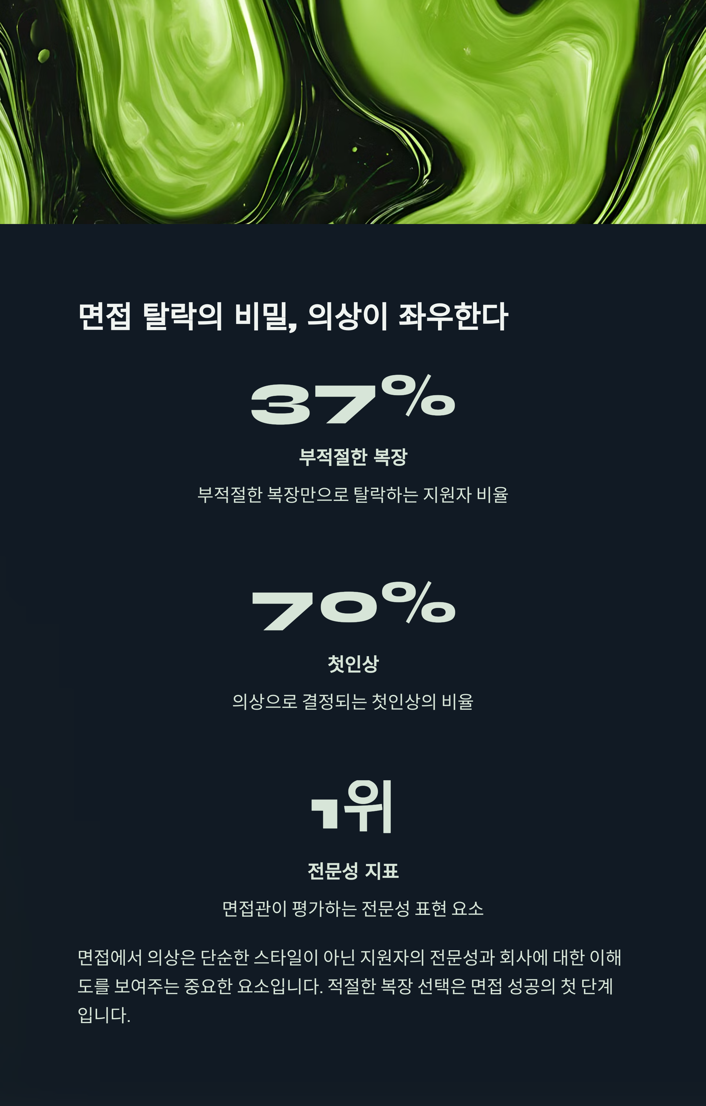이런 경험, 있으신가요? 첫인상은 15초 안에 결정되고, 면접관의 37%가 부적절한 복장 때문에 지원자를 탈락시킨다는 연구 결과가 있습니다. 완벽한 이력서와 준비된 답변이 있어도 부적절한 면접 복장 하나로 모든 노력이 물거품이 될 수 있어요.