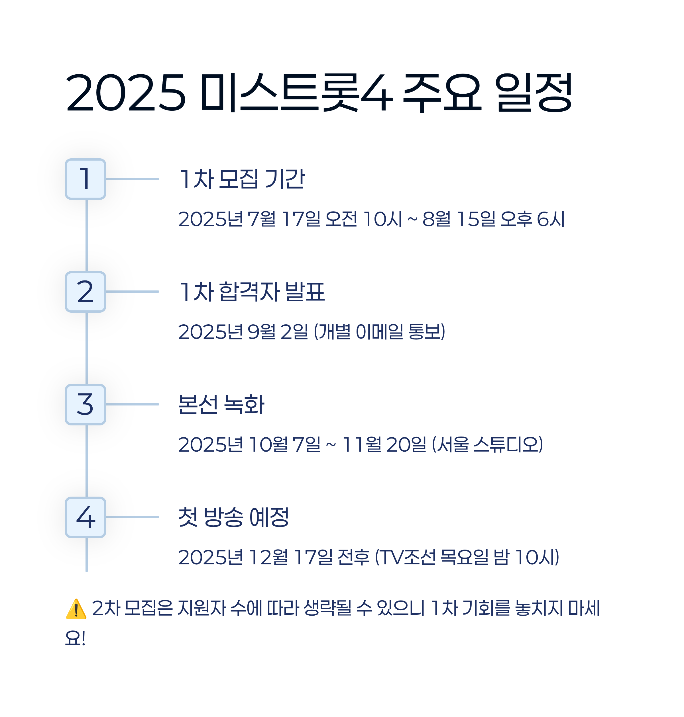 가장 중요한 정보, 바로 방송 일정과 모집 기간이죠! 1차 모집은 2025년 7월 17일부터 8월 15일까지 약 한 달간 진행되는데요. 2차 모집은 지원자 수에 따라 생략될 수도 있다고 하니, 조금이라도 관심이 있다면 이번 1차 기회를 절대 놓치지 마세요!