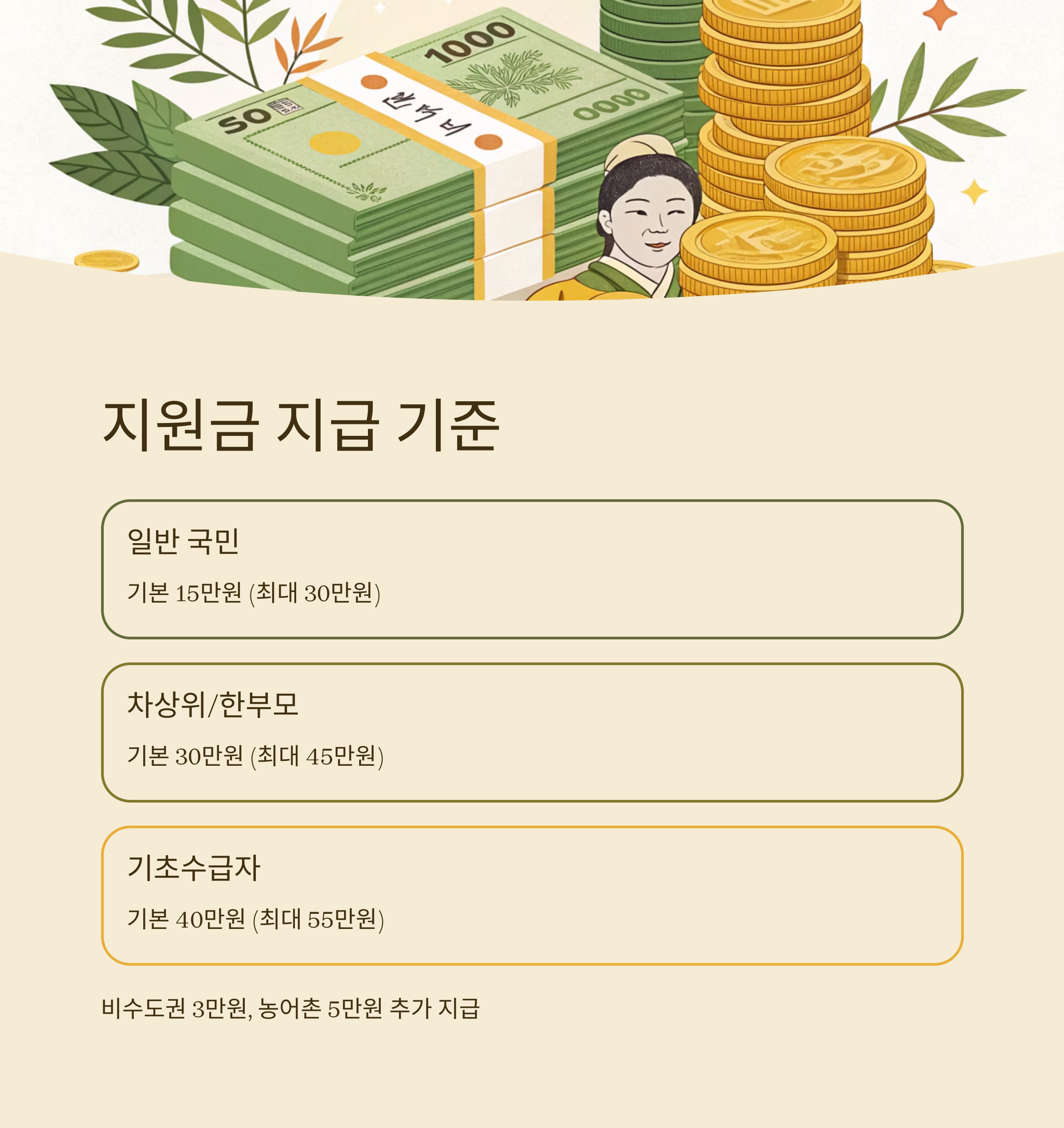 구분 기본 지급액 비수도권 추가 농어촌 추가 2차 추가 최대 수령