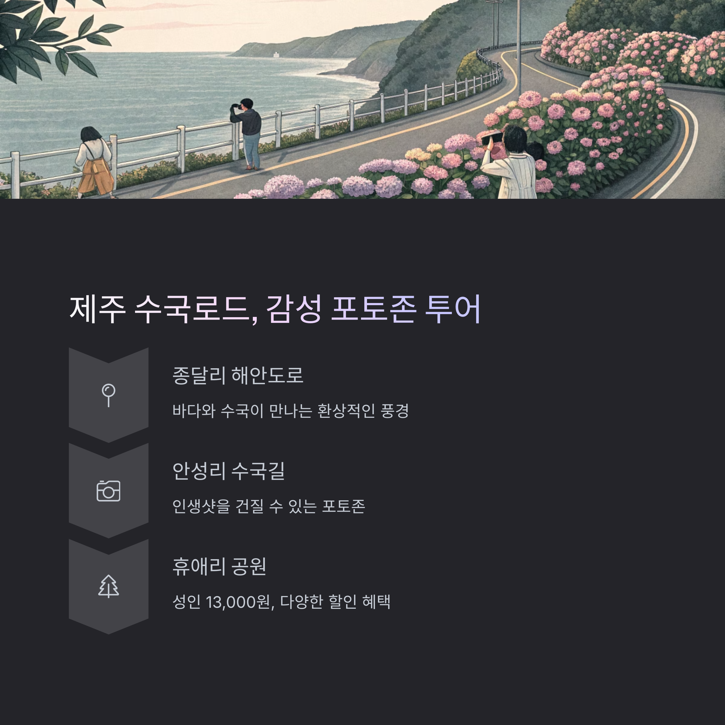 - SNS 인증샷 포인트: 도초도 수국정원 전망대, 쑥섬 수국터널, 종달리 해안도로 벤치