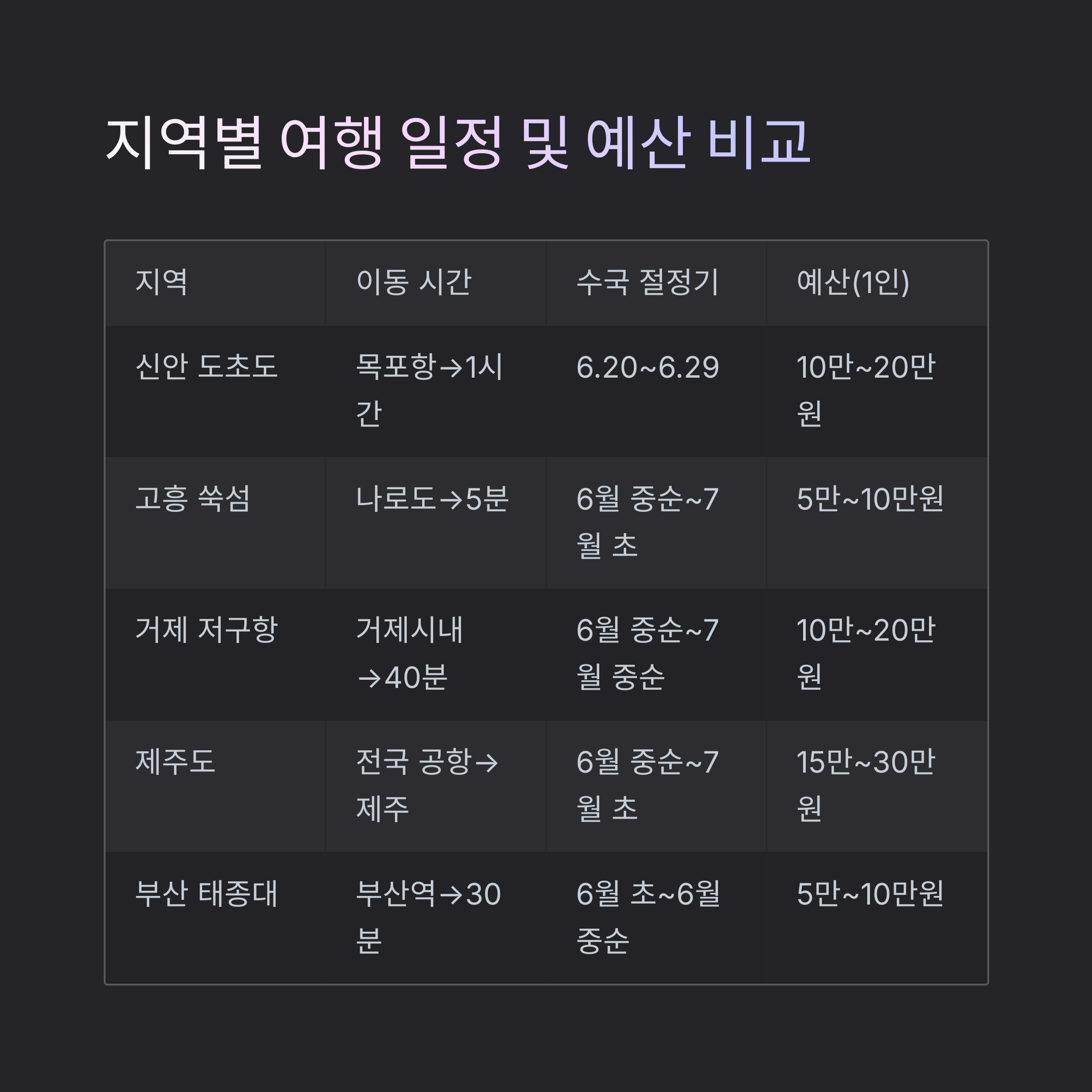 | 제주도 | 전국 공항 → 제주 | 6월 중순~7월 초 | 1박 2일~2박 3일 | 15만~30만원 |