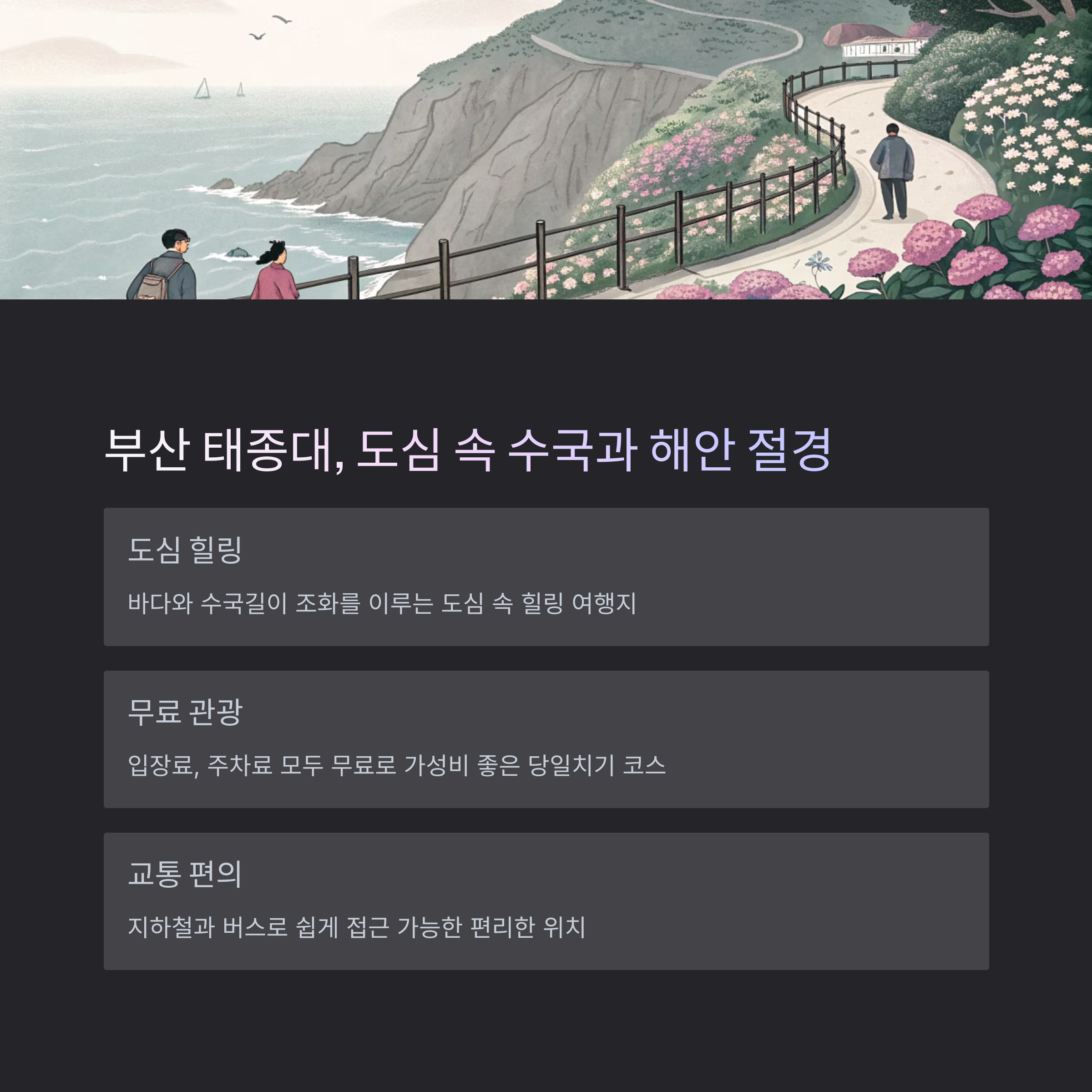 | 부산 태종대 | 부산역 → 30분 | 6월 초~6월 중순 | 당일치기 | 5만~10만원 |