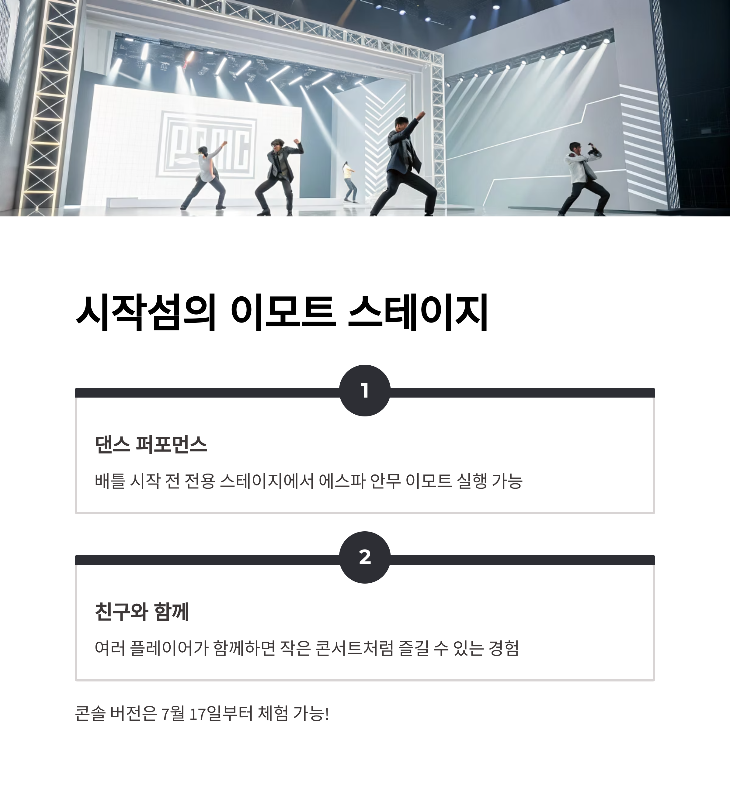배틀 시작 전, 시작섬에 설치된 전용 이모트 스테이지에서