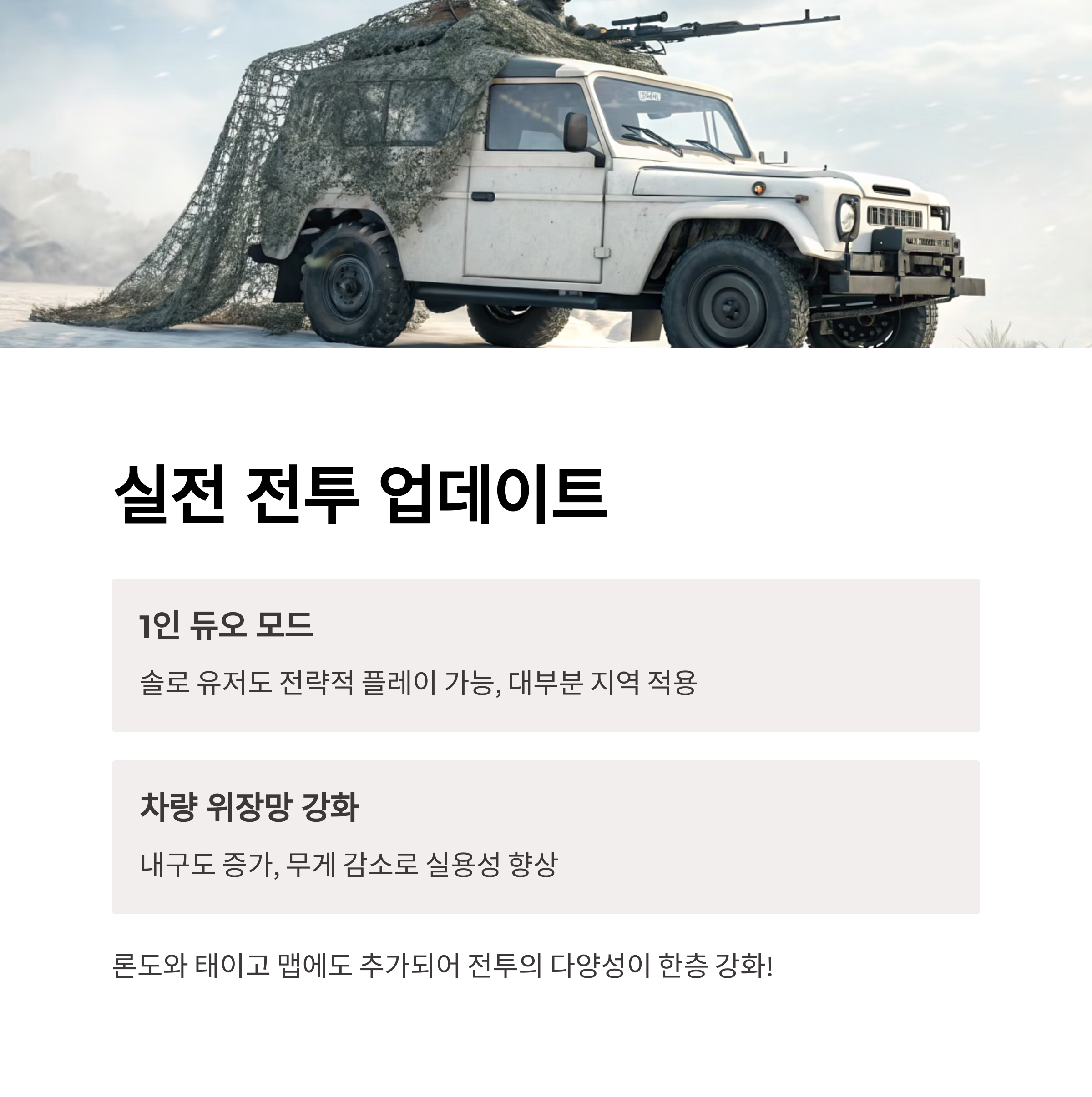 1인 듀오부터 차량 위장망까지, 실전 전투도 더 치열하게