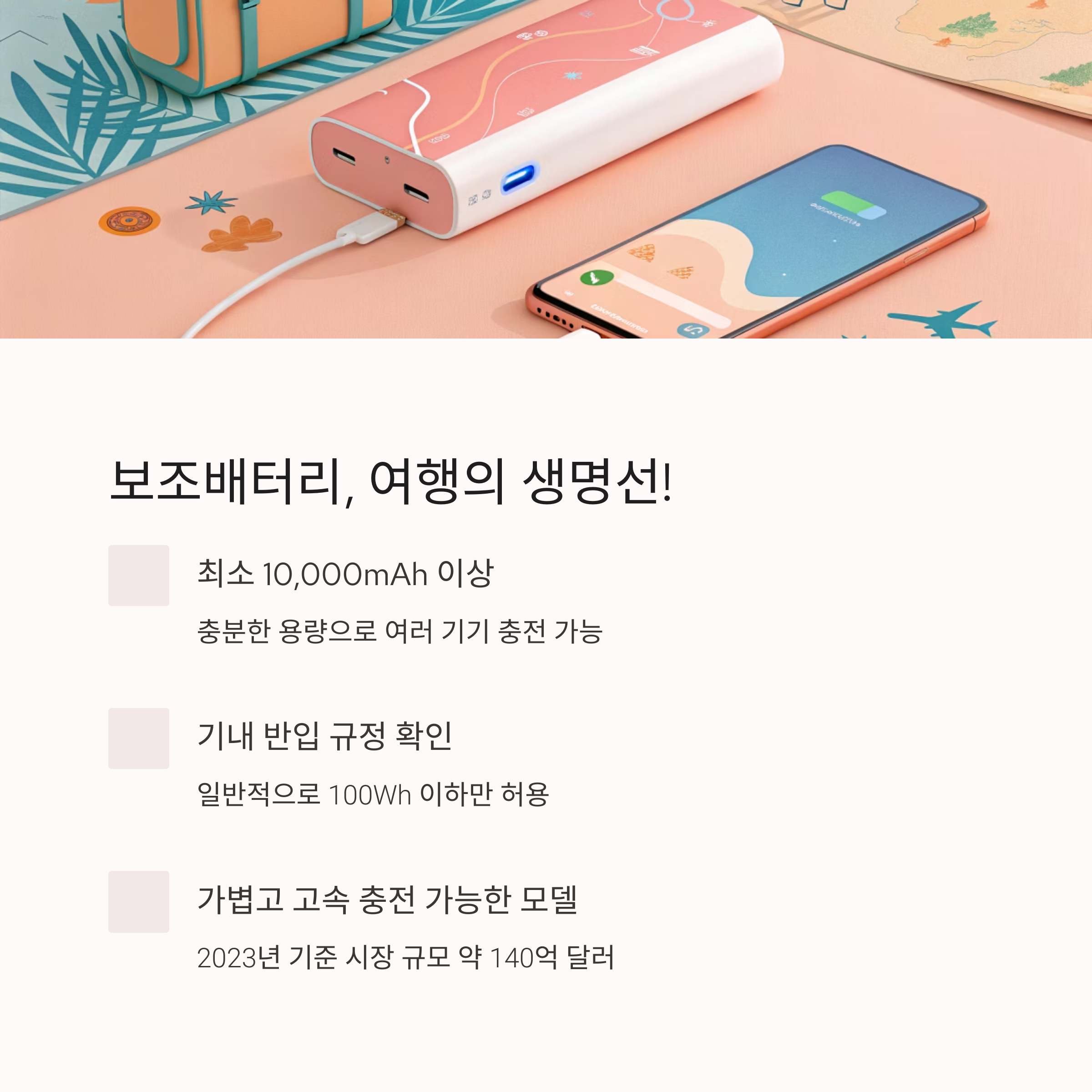 (일반적으로 100Wh 이하만 허용됩니다.) - 무게가 가볍고, 고속 충전이 가능한 모델을 선택하면 좋습니다.