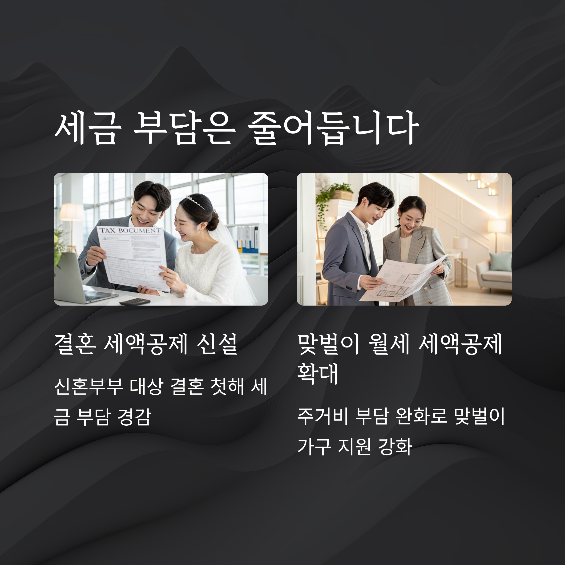 - 결혼 세액공제: 혼인신고 시 부부 각 50만원, 최대 100만원 공제