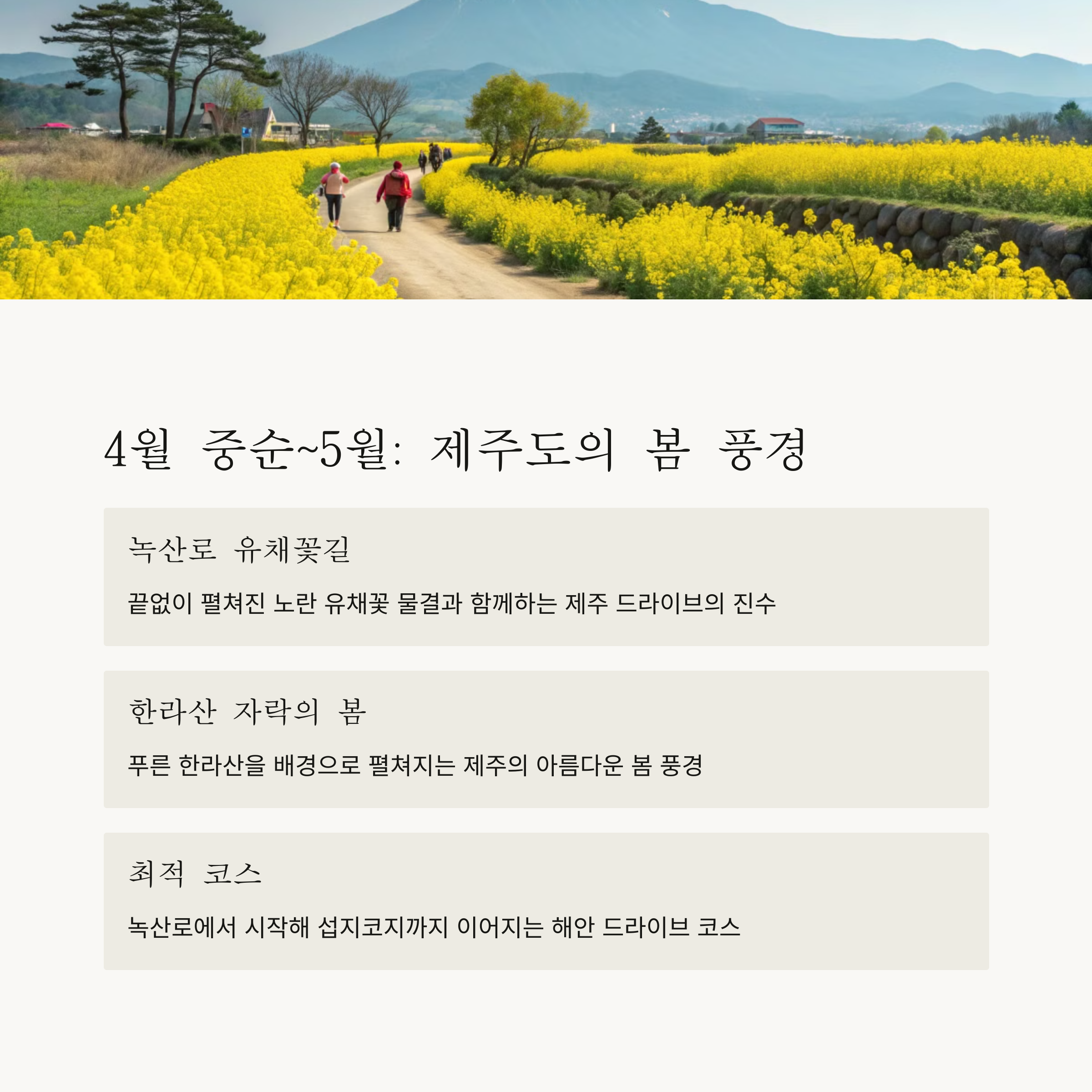- 4월 중순~5월: 유채꽃, 철쭉 드라이브 코스