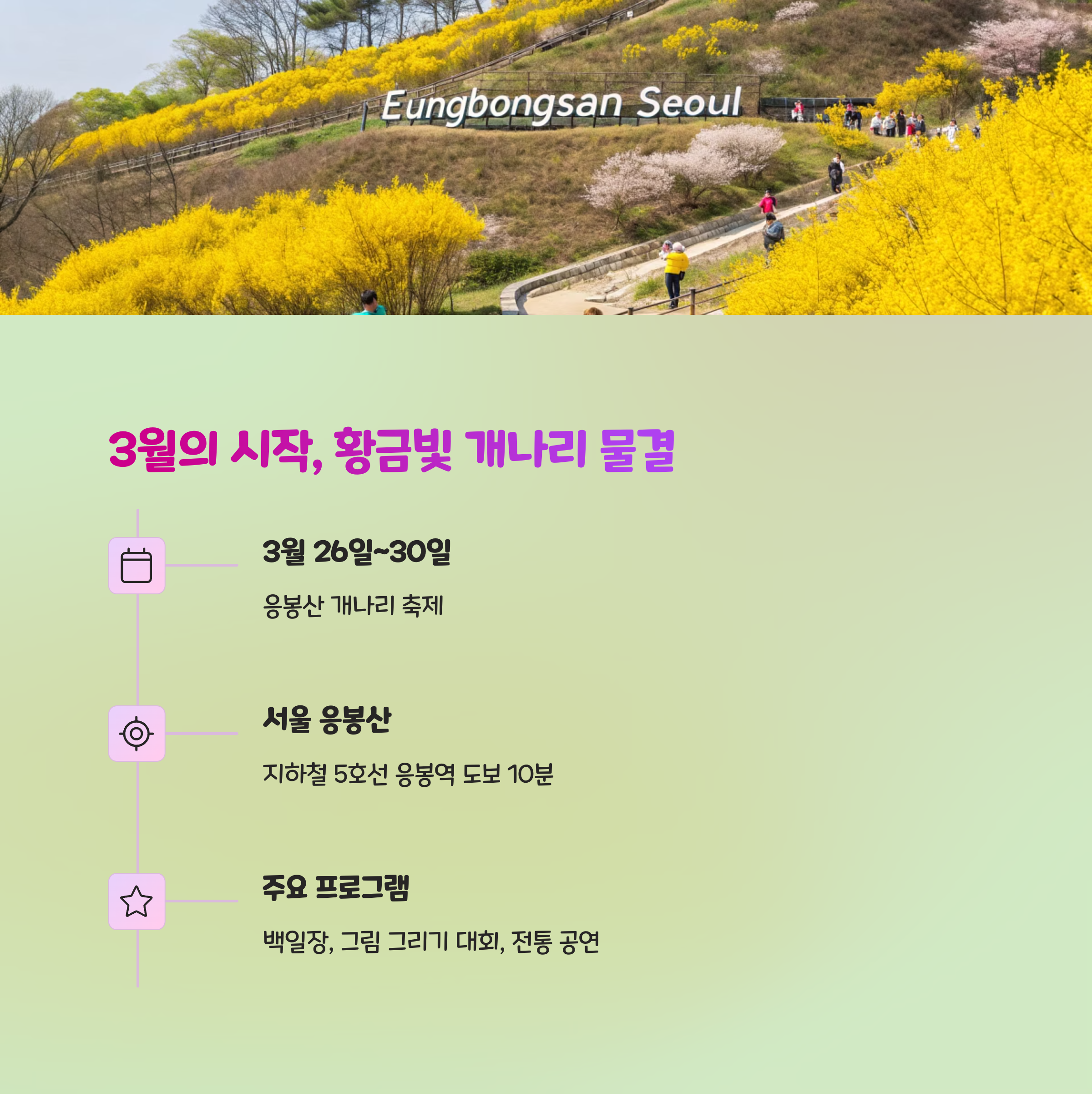 봄꽃 축제의 시작을 알리는 서울 응봉산 개나리 축제가 열립니다. 노란 개나리가 산을 뒤덮는 장관과 함께 한강과 기차가 어우러진 멋진 경치를 감상할 수 있어요. 다양한 체험 활동과 라이브 콘서트, 공연도 준비되어 있으며 무료 입장입니다.