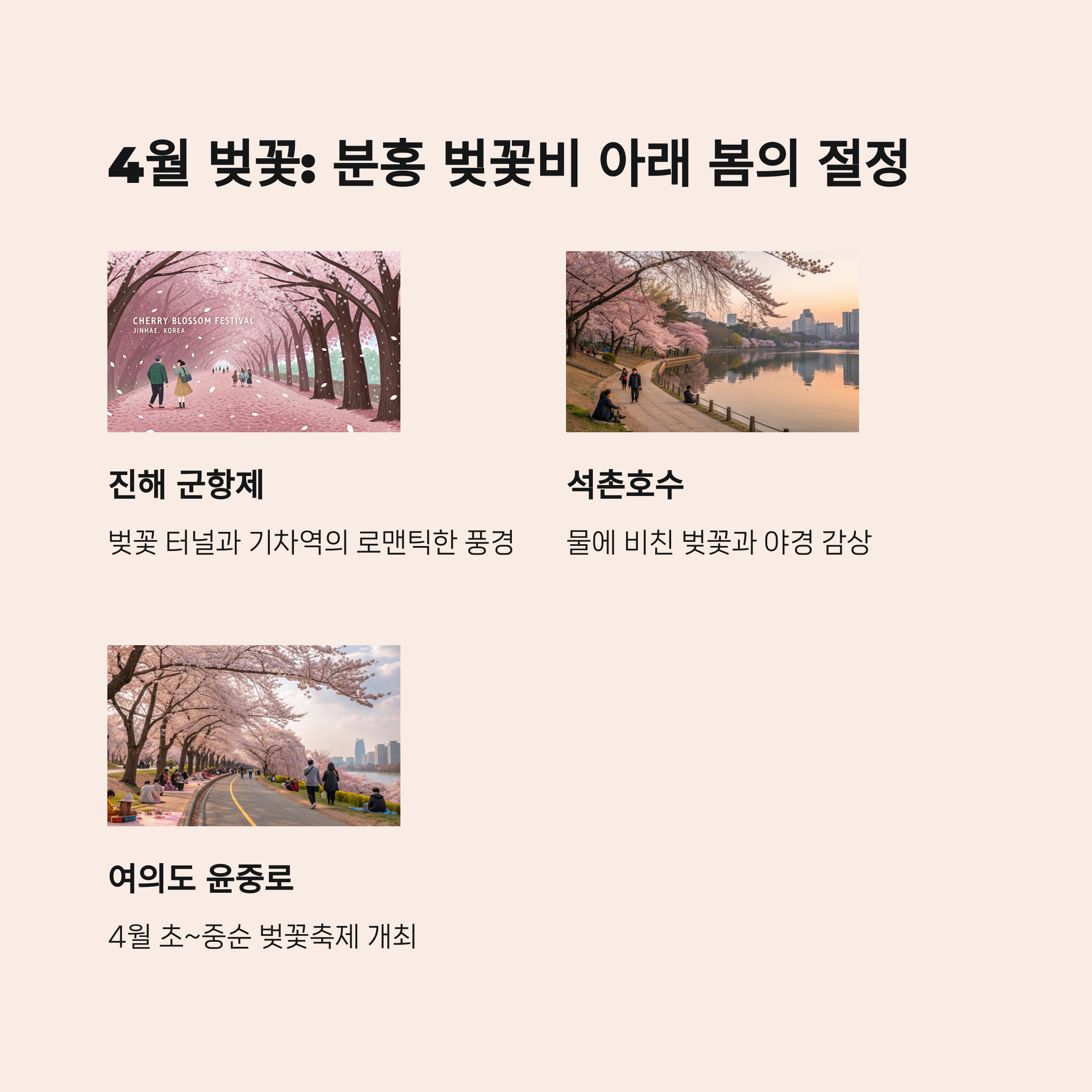 - 추천 코스: 경주(3월 말) → 진해(4월 초) → 서울(4월 중순)
