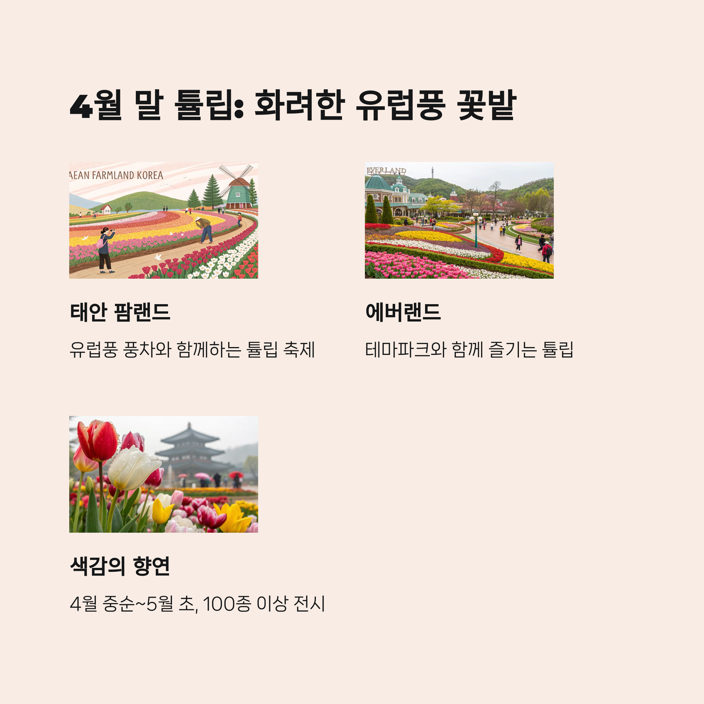 | 4월 말~5월 초 | 튤립 | 태안 팜랜드, 에버랜드 | 화려한 색상의 향연 |