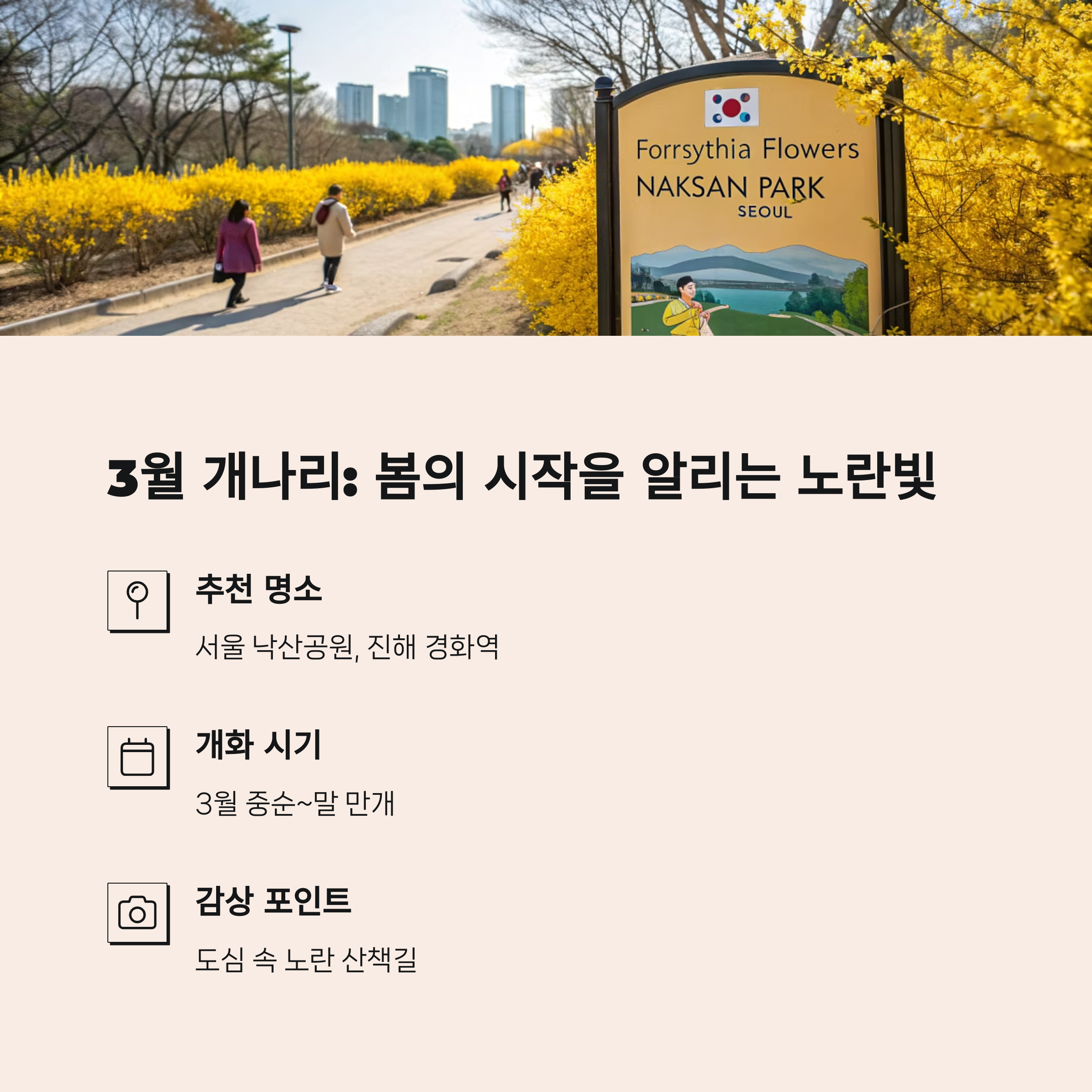 | 3월 중순~말 | 개나리 | 서울 낙산공원, 진해 경화역 | 도시와 어우러진 노란 봄의 시작 |
