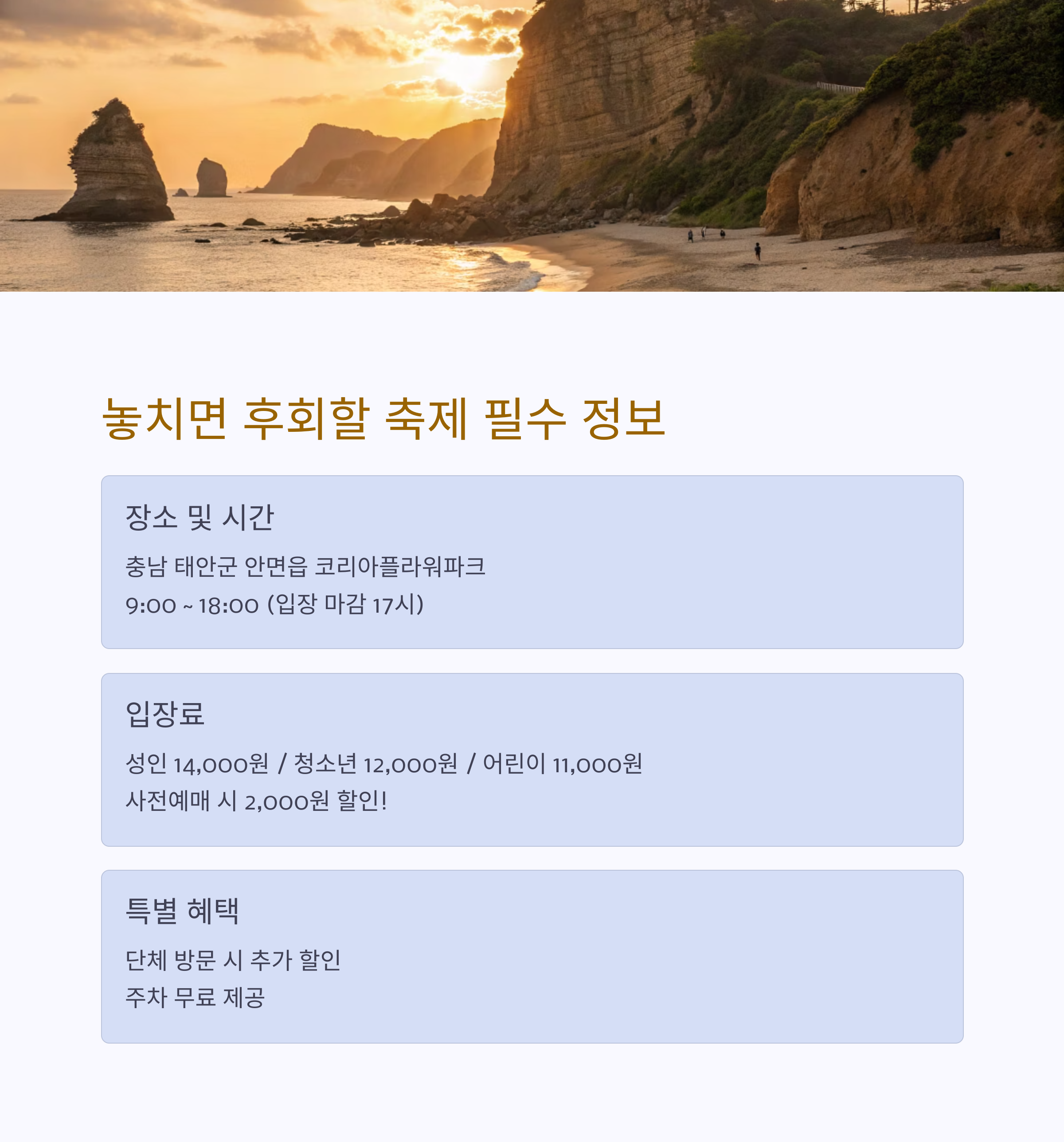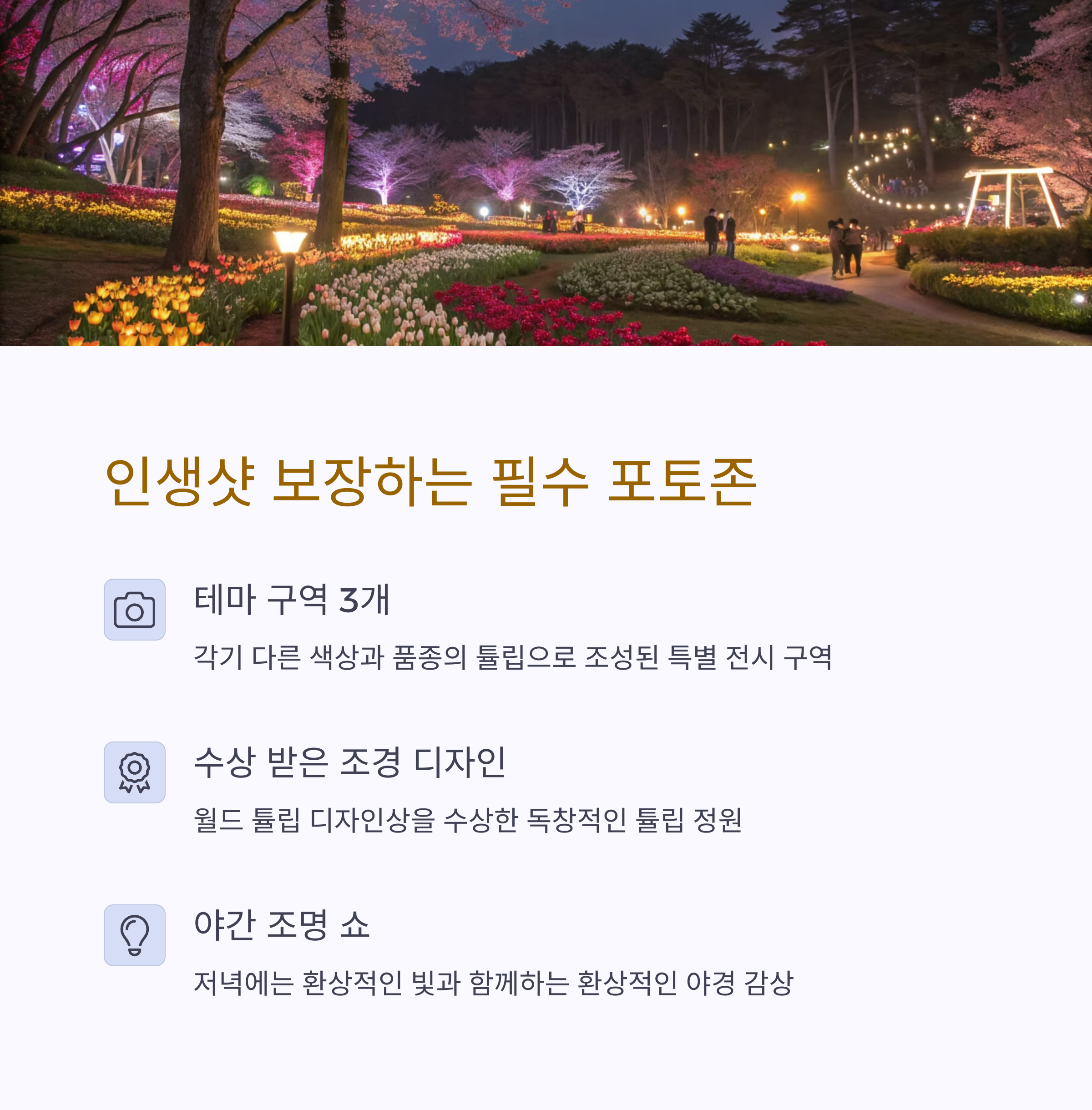 태안 튤립 축제는 단순한 꽃 구경을 넘어 다양한 체험 활동과 야간 조명 쇼까지 즐길 수 있는 종합 축제입니다. 가족, 연인, 친구들과 함께 방문하기 좋은 봄 여행지입니다.