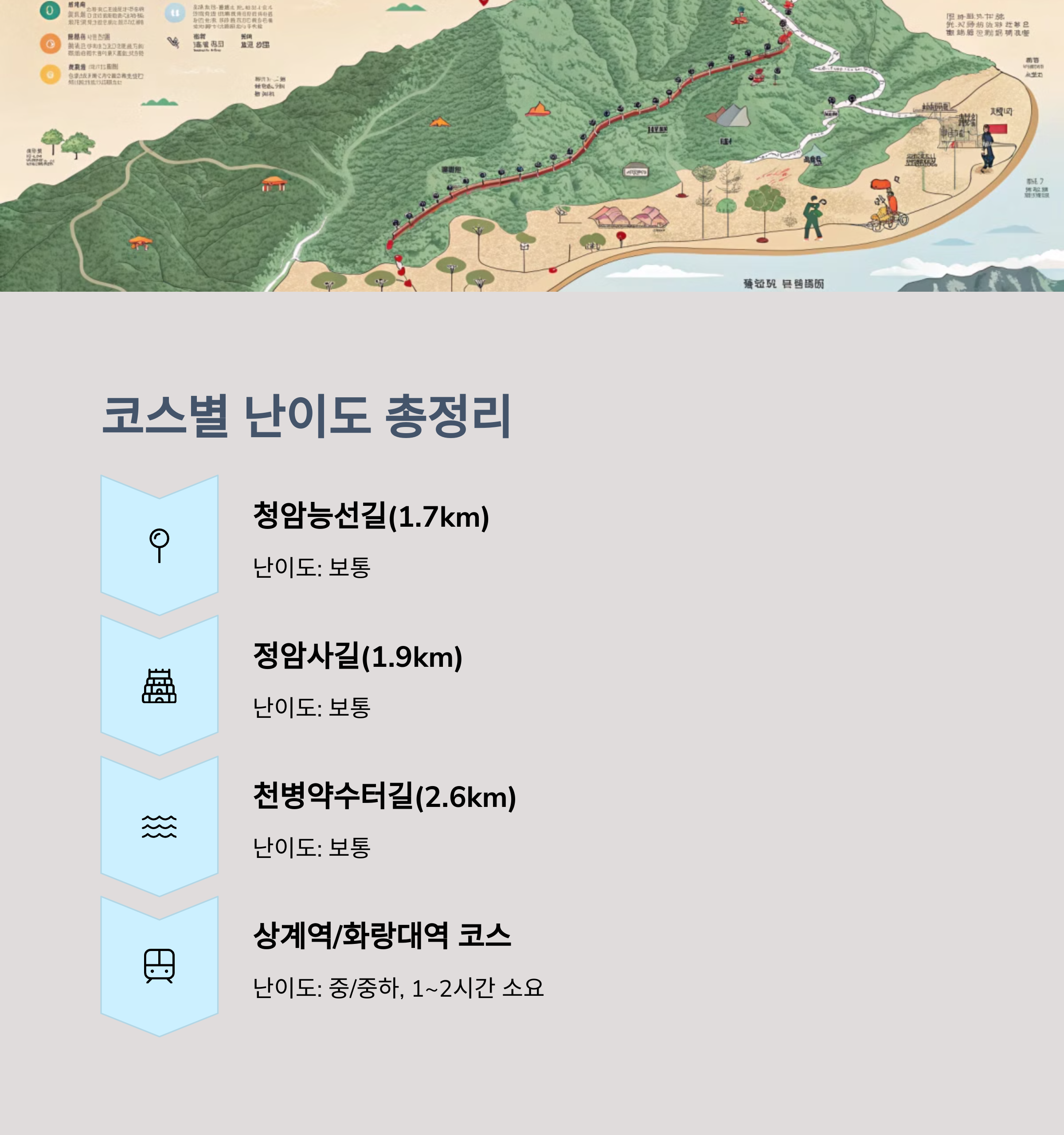 | 불암산 주요 코스 | 7개의 대표 코스와 다양한 난이도로 구성되어 있습니다. |